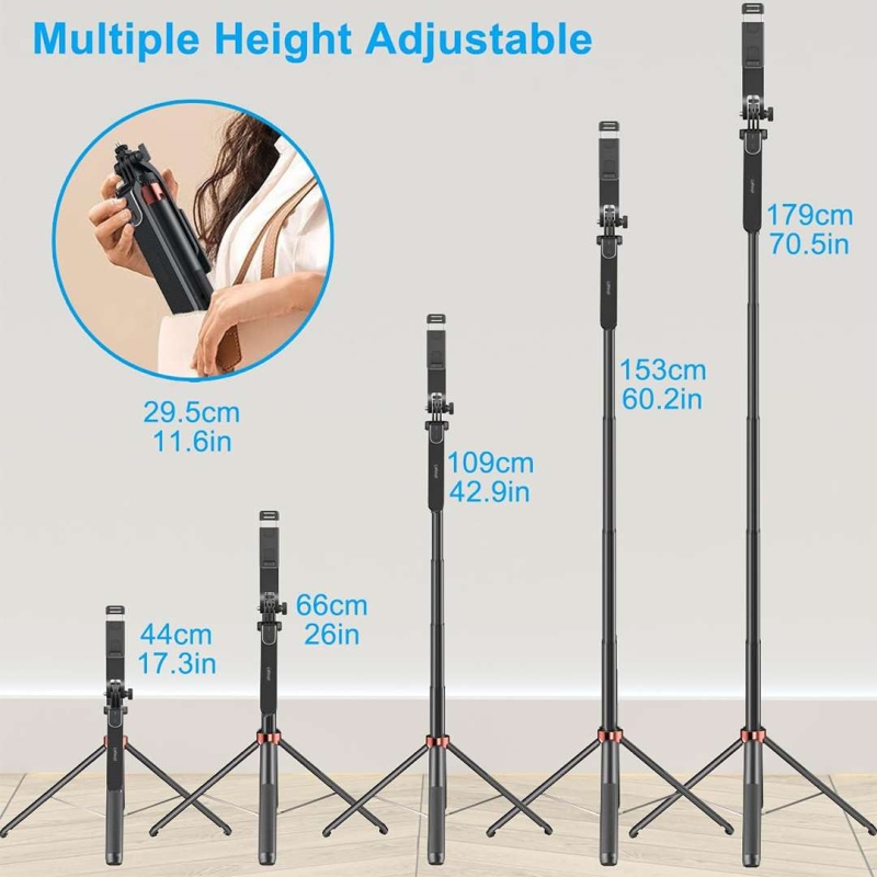 The celfiexpt quadripod selfie stick tripod is a heavy-duty, extra-long solution designed for creators, vloggers, and travelers. Featuring an anti-shake balance handle, 360° panoramic rotation, and a reinforced 4-leg quadripod base, it delivers superior stability for clear photos and videos. With support for smartphones, action cameras, mirrorless cameras, ring lights, and microphones, plus a rechargeable Bluetooth remote, it’s ideal for live streaming, YouTube, photography, and makeup shoots.