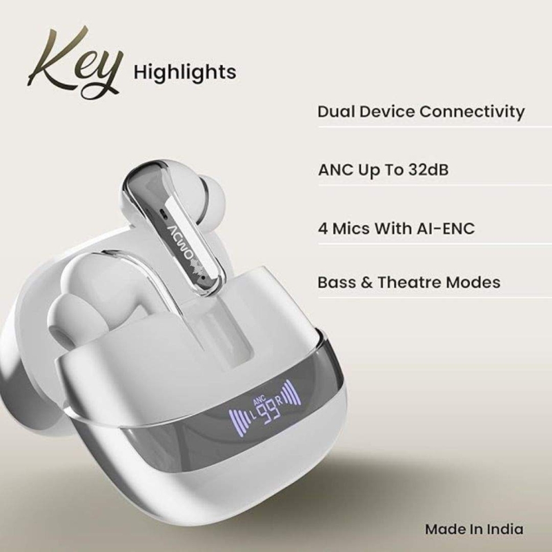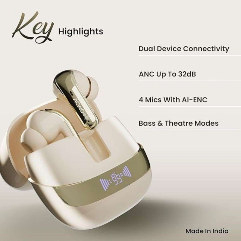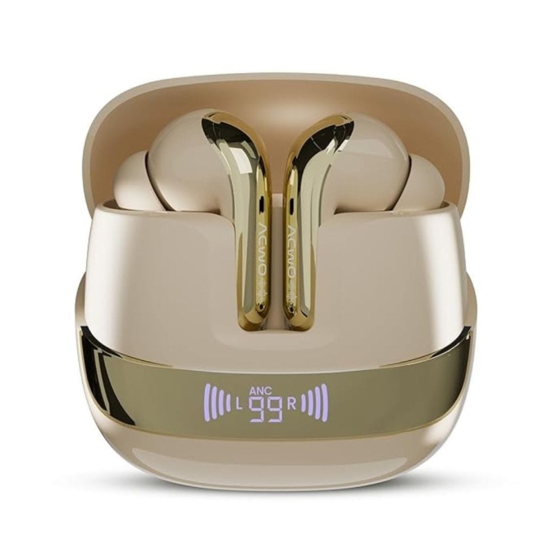 The ACwO DwOTS 747 wireless earbuds in Coffee Cream offer a premium audio experience with up to 32dB Active Noise Cancellation, AI-powered 4-mic ENC, and dual device connectivity. Designed with a chrome finish for durability and style, they boast 65 hours of total battery life, Bluetooth 5.4, a 13mm dynamic driver, and a digital battery display, making them ideal for travel, work, and entertainment.