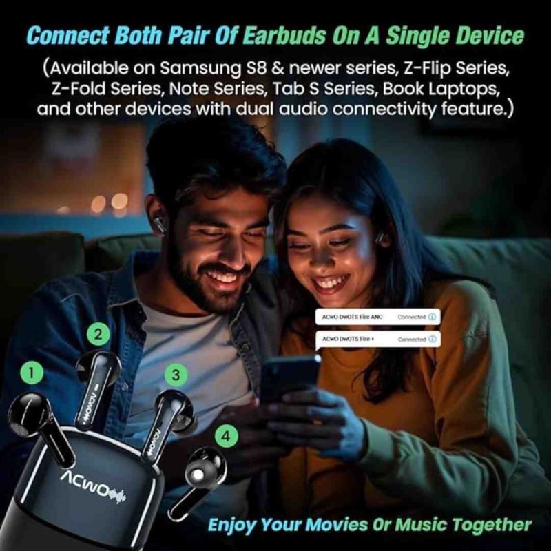 The ACwO DwOT Fire ANC earbuds offer a premium audio experience with Active Noise Cancellation up to 32dB, immersive 3D Spatial Audio, and ultra-low 45ms latency for real-time gaming and video sync. Enjoy up to 70 hours of playtime, crystal-clear calls with AI-ENC quad mics, and dual-device connectivity. Designed in India, these earbuds are perfect for music, business, fitness, and entertainment on the go. NO RETURN