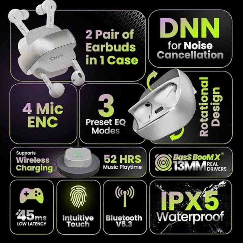 Experience next-level audio with India’s first Dual Sharing TWS. Designed for immersive sound, long battery life, and seamless connectivity, these earbuds offer 52 hours of playtime, advanced Bluetooth 5.3, AI-ENC quad mic clarity, and 3+3 EQ modes. Perfect for entertainment, workouts, and calls, with intuitive touch controls, wireless charging, and IPX5 water resistance. NO RETURN