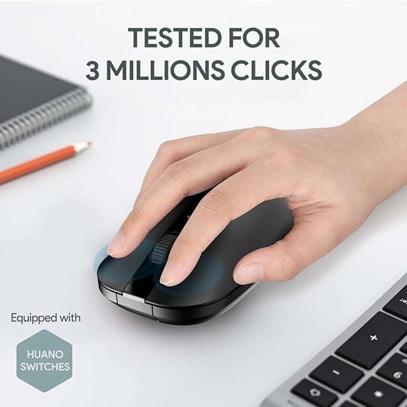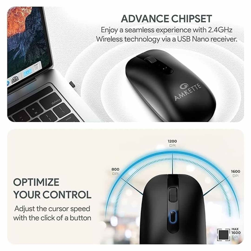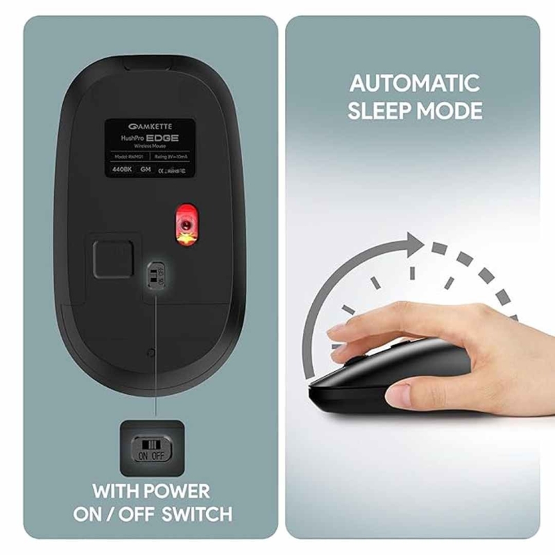 The Amkette Hush Pro Edge Wireless Mouse delivers smooth 2.4 GHz lag-free performance, durable Huano switches rated for 3 million clicks, and precise control with adjustable DPI levels. Its sleek and sturdy design ensures reliable everyday use, making it ideal for work, study, or casual computing.