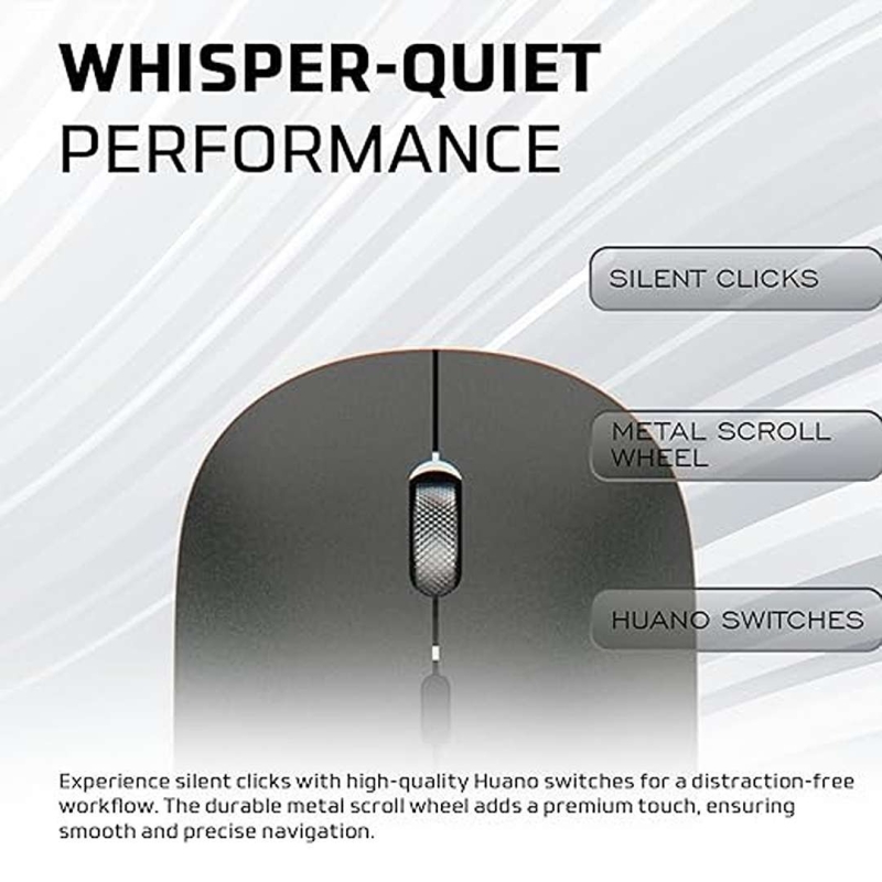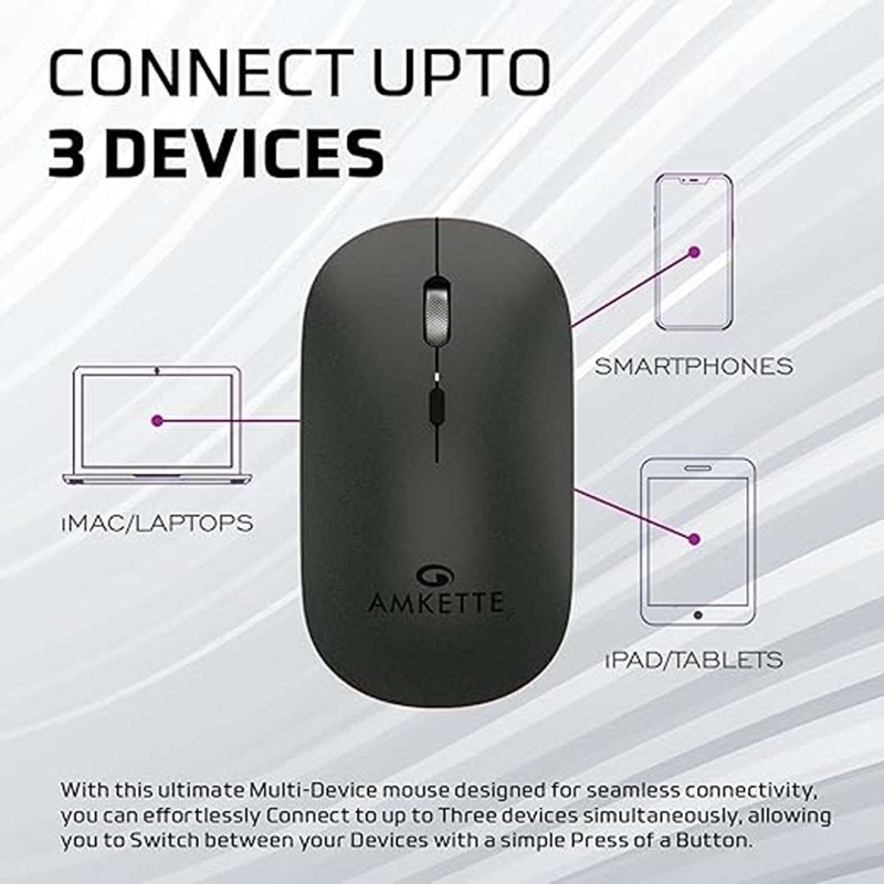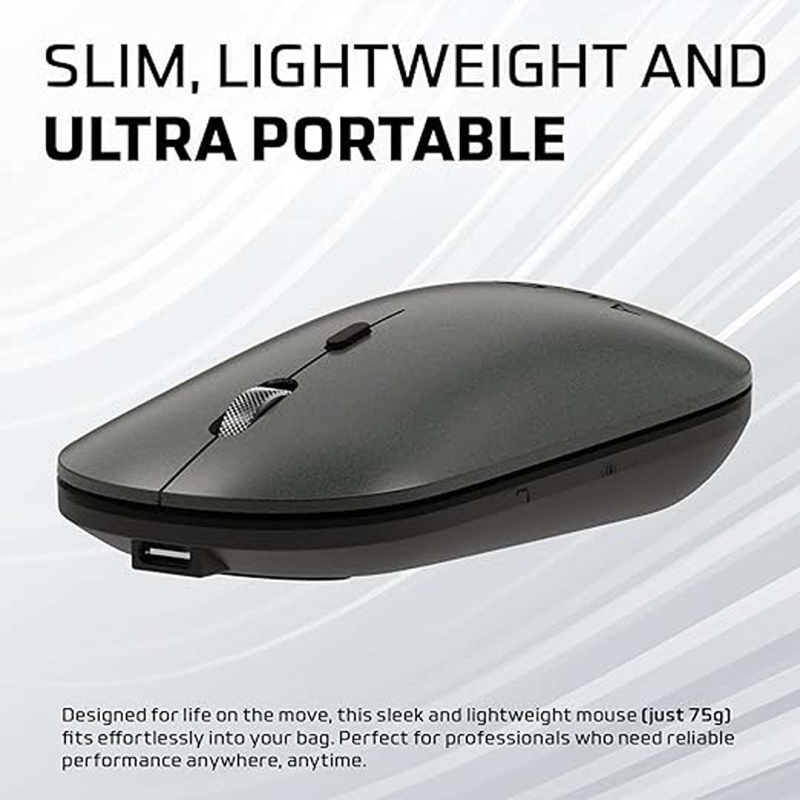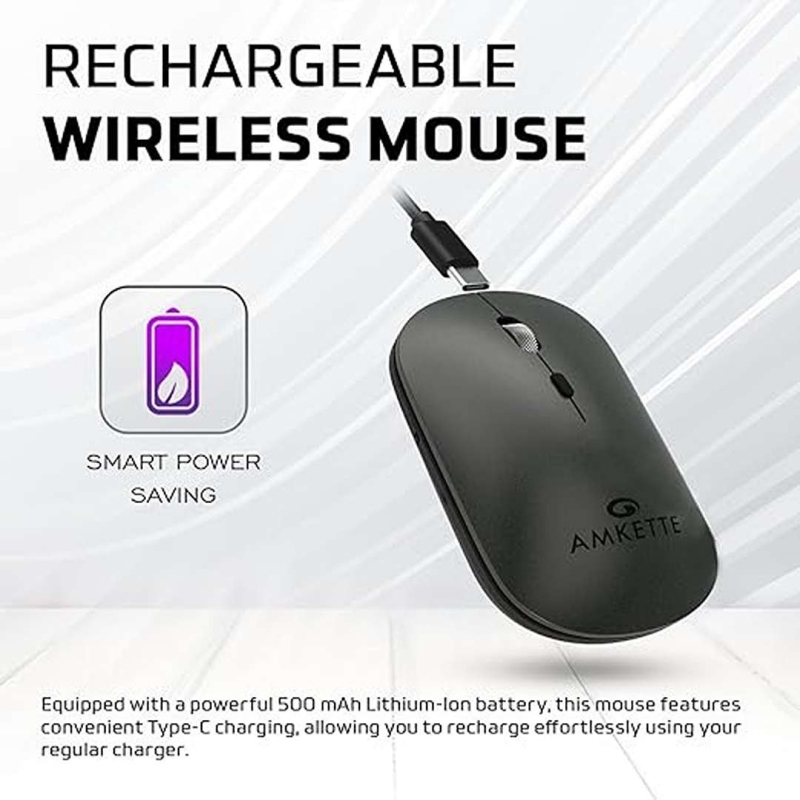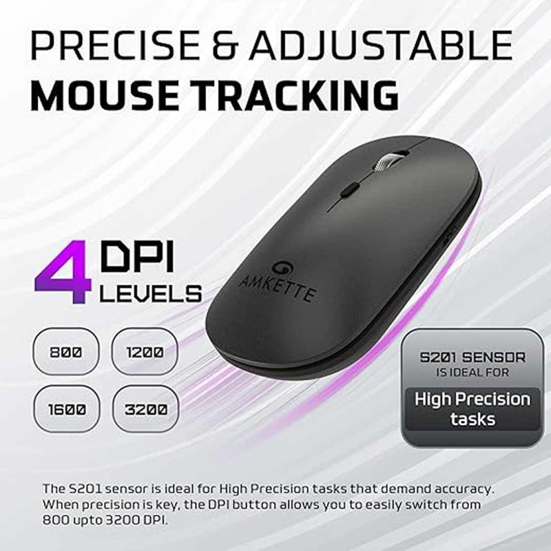 The Amkette Hush Pro Epic LP Rechargeable Wireless Mouse offers seamless multi-device connectivity with dual Bluetooth and 2.4GHz support. Designed for precision and comfort, it features an S201 optical sensor with adjustable DPI up to 3200, a lightweight 75g ergonomic build, silent Huano switches, and a long-lasting 500mAh Type-C rechargeable battery—perfect for professionals who need silent, reliable performance.