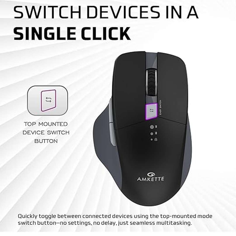 The Amkette Hush Pro Epic M Rechargeable Wireless Mouse is designed for seamless multi-device productivity with dual Bluetooth and 2.4GHz wireless connectivity. It features an ergonomic right-handed design, silent switches, a high-precision S201 sensor with adjustable DPI up to 3200, LED battery indicators, and a long-lasting 400mAh rechargeable battery—perfect for professional, quiet, and efficient work environments.
