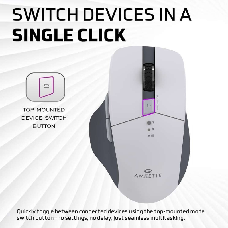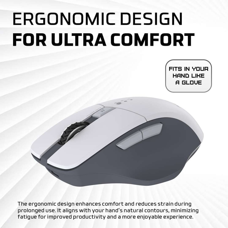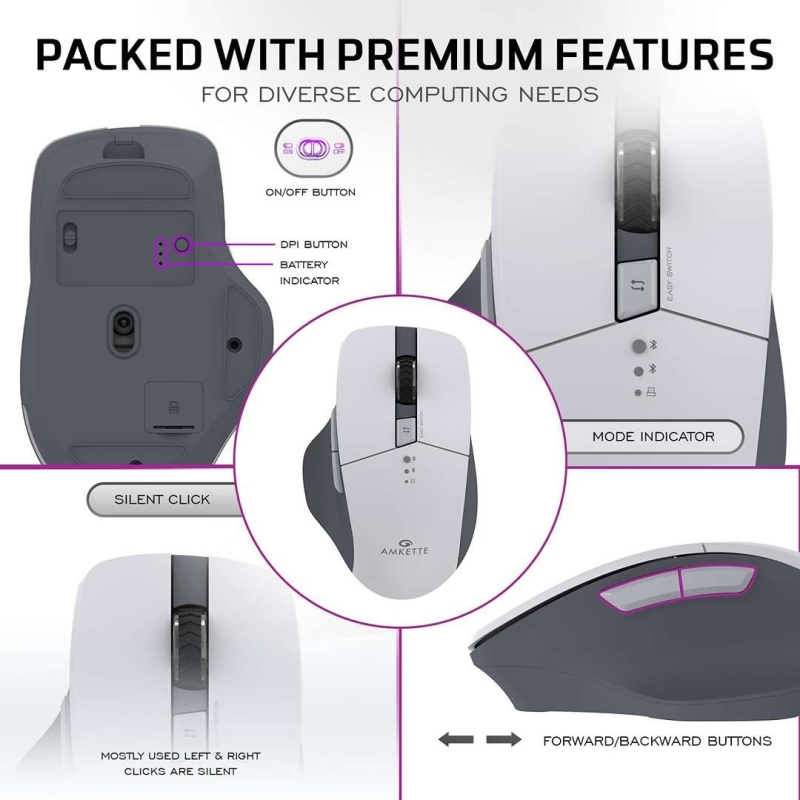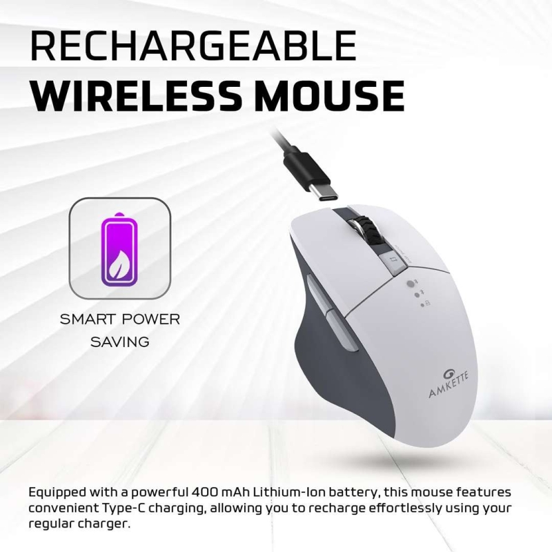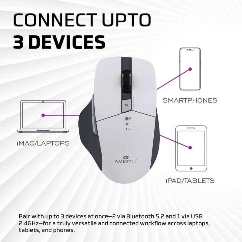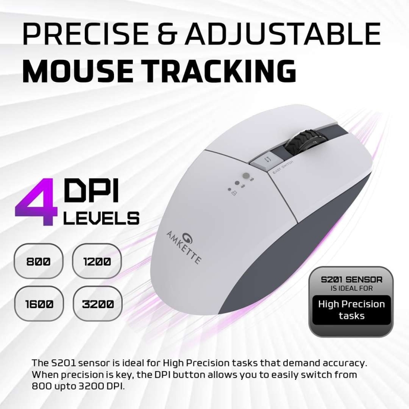 The Amkette Hush Pro Epic M Wireless Mouse (White) offers seamless multi-device connectivity with Bluetooth (BT1 & BT2) and 2.4GHz wireless modes. Designed for comfort and quiet operation, it features silent switches, an ergonomic right-handed shape, an S201 high-precision sensor with DPI up to 3200, LED battery indicators, and a powerful 400mAh rechargeable battery—ideal for professionals who want smooth, silent, and efficient workflow control.