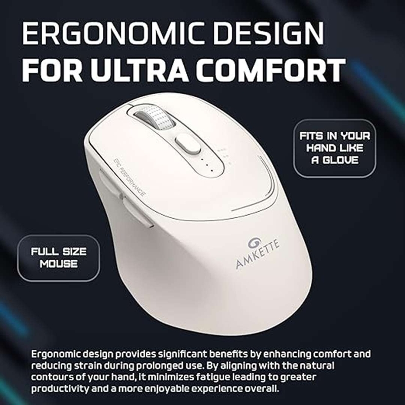 The Amkette Hush Pro Epic Wireless Mouse (White) is a premium multi-device mouse designed for smooth, silent, and productive work. With Bluetooth (BT1 & BT2) + 2.4GHz wireless connectivity, silent switches, an ergonomic shape, adjustable DPI up to 2400, and a long-lasting 500mAh rechargeable battery with Type-C charging, it is ideal for professionals seeking comfort, precision, and quiet operation.