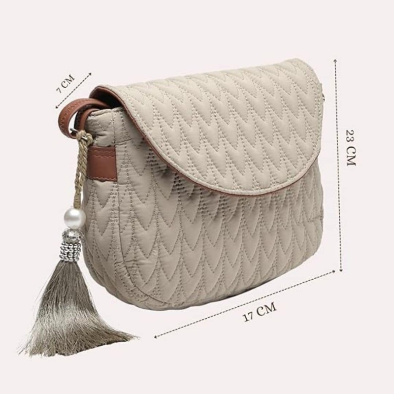 The Anekaant Uno Sling Bag is a stylish and compact everyday accessory designed for all-season use. Crafted from durable polyester with a chic chevron quilted pattern and a vegan leather strap, it offers secure storage, practical pockets, and a neutral beige–tan color combination that pairs effortlessly with western outfits.