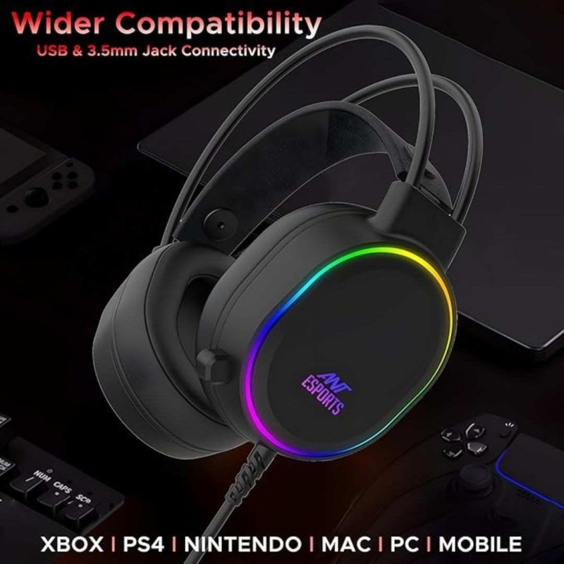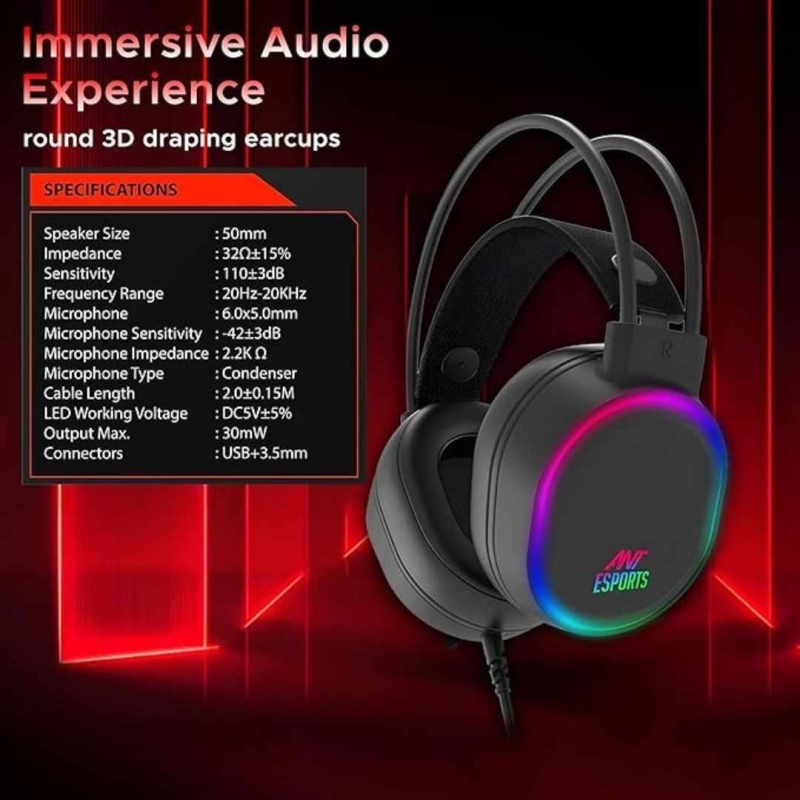 Step into immersive gaming with the Ant Esports H1000 Over-Ear Gaming Headset, engineered for crystal-clear sound and superior comfort. Featuring 50mm drivers, noise-isolating 3D draping earcups, and a high-sensitivity mic, it's perfect for intense gameplay. With RGB LED illumination and wide compatibility across platforms like PC, PS4, Xbox, and mobile, the H1000 delivers both style and performance. The lightweight, self-adjusting design ensures all-day comfort, while onboard controls offer easy volume and mic management.