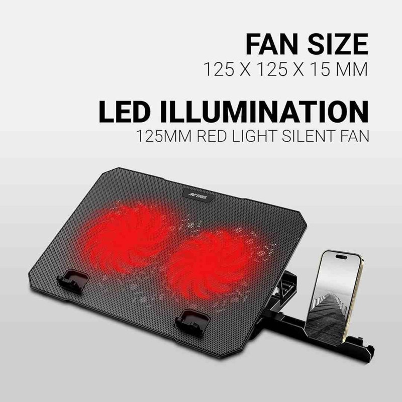 The Ant Esports Acrylic Laptop Cooling Pad offers a sturdy and ergonomic design for laptops up to 15.6 inches. It features 5 adjustable height settings, silicon anti-slip pads, a dual USB port, and a hideable mobile phone stand, ensuring efficient cooling, stability, and comfortable usage for work or gaming.