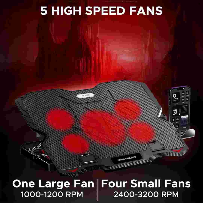 The Ant Esports NC190 laptop cooler is designed to efficiently cool laptops up to 15.6 inches. Featuring a large central fan with four smaller fans, metal mesh construction, 5 adjustable ergonomic heights, dual USB ports, a flip-up grip, and a side phone holder, it ensures stable laptop use, improved airflow, and convenient workspace organization.