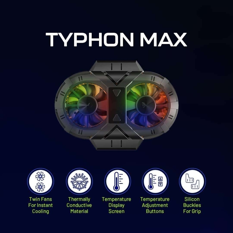 The Archer Tech Lab Typhon Max is a high-performance mobile gaming cooler designed for Android and iOS devices. Equipped with dual turbo fans (5500 RPM) and premium thermally conductive materials, it ensures rapid heat dissipation for stable FPS and uninterrupted gameplay. Features include a digital temperature display, adjustable cooling controls, RGB lighting, and an extra USB port. The adjustable silicone grip fits most smartphones securely, and the package includes finger sleeves for enhanced gaming precision. Perfect for competitive gaming, eSports, streaming, and long mobile sessions.