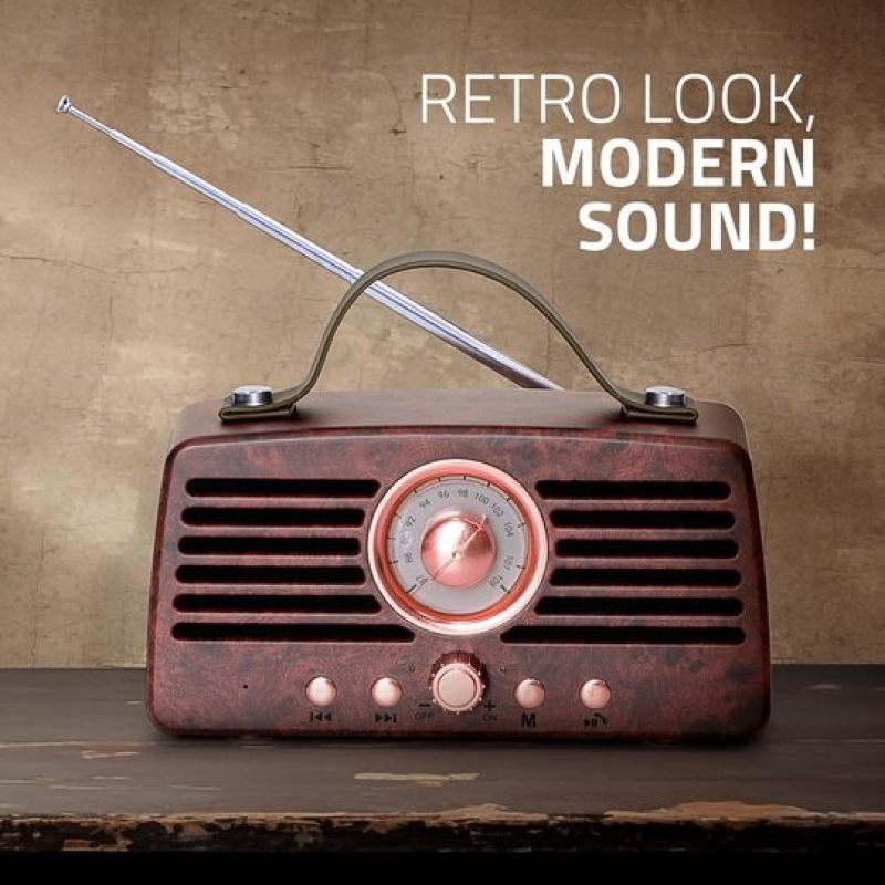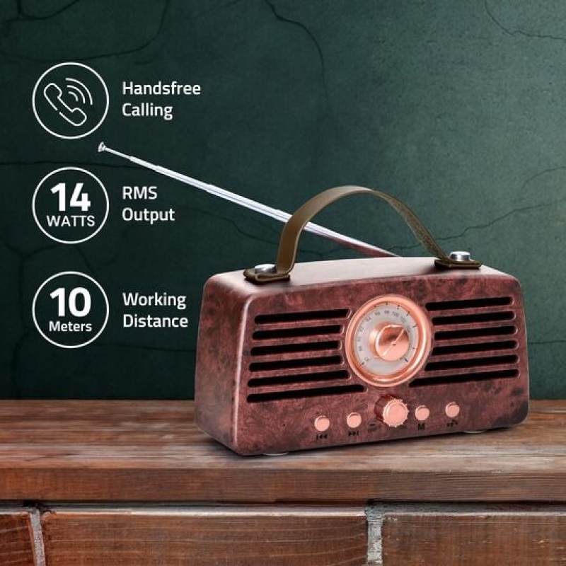 | Special Features | Retro design, Soft touch wood finish, PU leather handle, Hands-free calling mic, Dynamic sound effect |