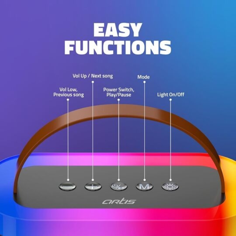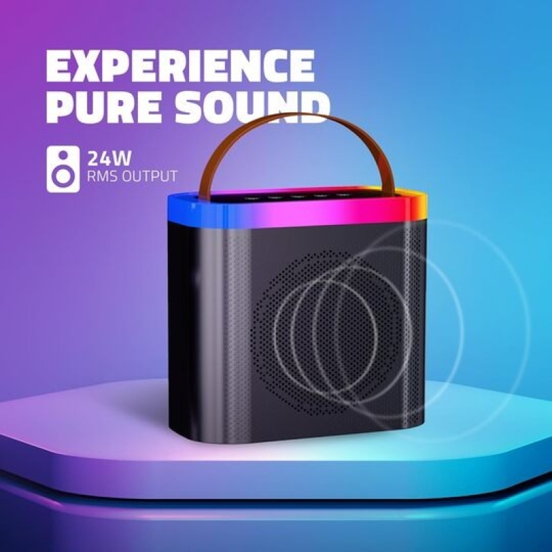 The Artis SoundMax 600 Black is a compact 24W RMS wireless Bluetooth speaker designed for both indoor and outdoor entertainment. It supports USB, AUX, Micro TF card, FM radio, and includes a wireless mic with multiple voice effects such as KTV, loli, and monster modes. Equipped with RGB glow lights and a 2400mAh rechargeable battery, it delivers 4–6 hours of dynamic, crystal-clear sound playback.