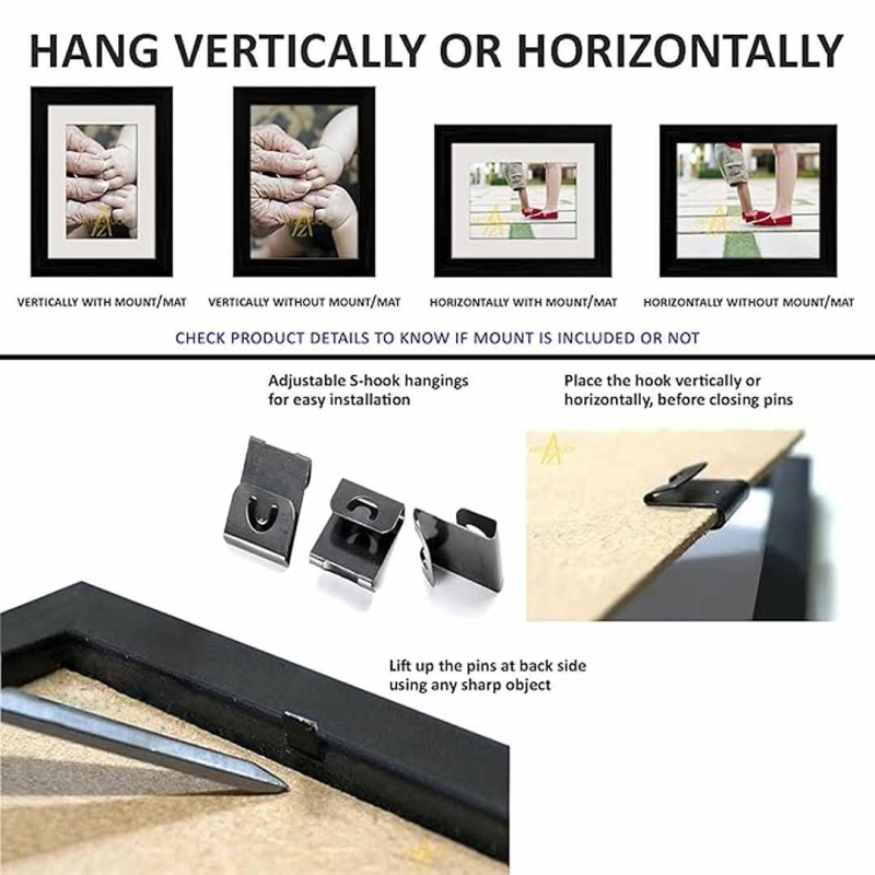 The ArtzFolio Wall Photo Frame Set (12 Units, 4x6 inch, Black) features durable polystyrene fibre frames with clear acrylic fronts, designed for easy photo changes with opening pins and adjustable wall hooks. Ideal for home decor, these lightweight, modern frames can be mounted vertically or horizontally and come pre-assembled.