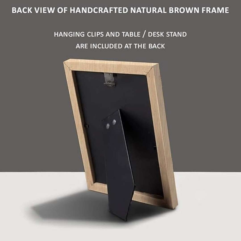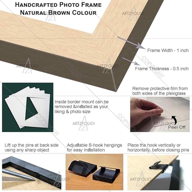 The ArtzFolio 6x6 Inch Wall & Table Photo Frame in Natural Brown is a single-unit, square-shaped frame ideal for displaying photos, awards, or diplomas. Made from durable polystyrene fibre with a clear acrylic front and a back stand, it supports tabletop use and easy photo replacement with adjustable hanging hooks and opening pins.