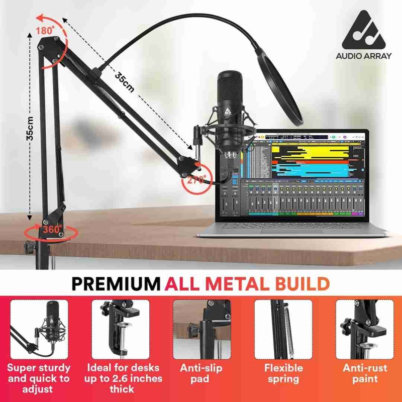 The Audio Array AM-C1 USB Condenser Microphone Kit is a complete studio-grade recording solution designed for streaming, podcasting, voiceovers, and online content creation. Featuring a 16mm cardioid condenser capsule with 192kHz/24-bit resolution, it delivers clear, focused, and professional audio. With true plug-and-play USB connectivity, premium metal accessories, and advanced noise control through a pop filter and foam cover, the AM-C1 is ideal for creators seeking high-quality sound with an easy setup.