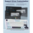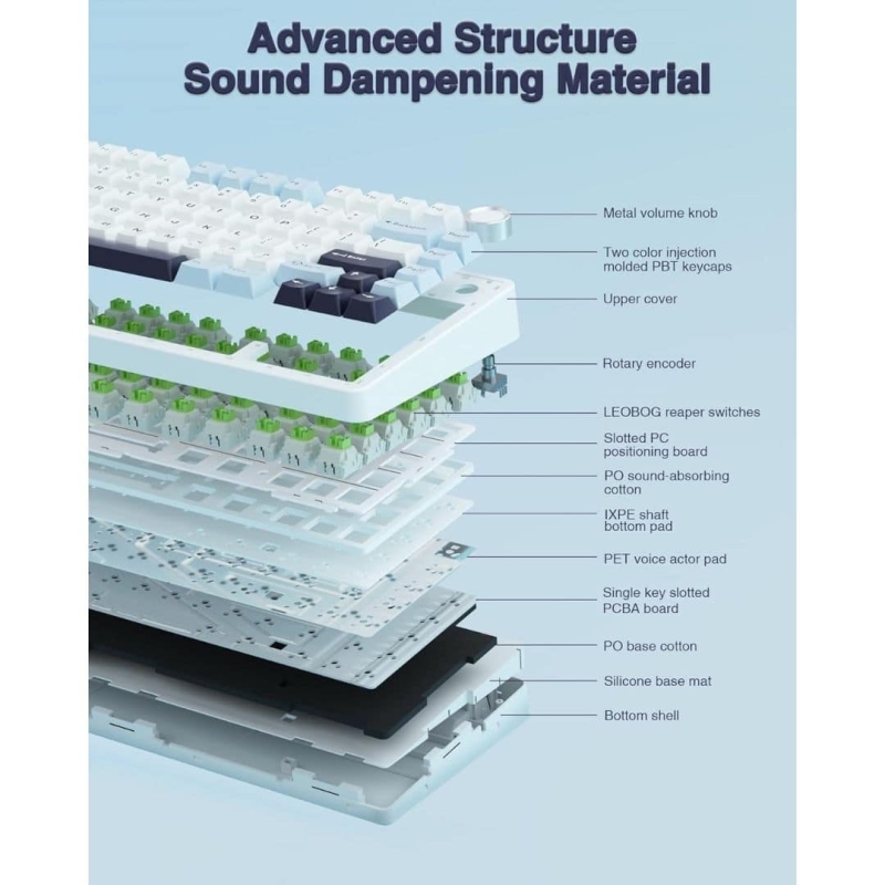 The AULA F75-Ice Blue Reaper is a 75% wireless mechanical gaming keyboard with tri-mode connectivity (2.4GHz, Bluetooth, USB Type-C). It features hot-swappable linear switches, 16.8 million RGB backlighting, ergonomic design, a multifunction control knob, and a compact layout for professional gaming across multiple devices.