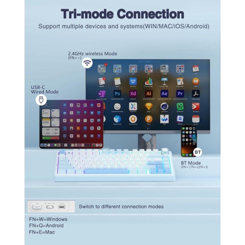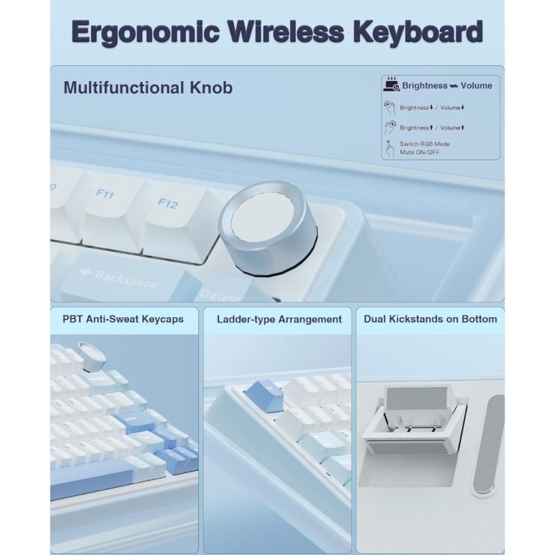 The AULA F75-Sea Blue Graywood is a professional 75% wireless mechanical gaming keyboard with tri-mode connectivity (2.4GHz, Bluetooth, USB-C). It features hot-swappable linear switches, 16.8 million RGB backlighting, a multifunction control knob, ergonomic design, and water-repellent keys for an immersive gaming experience across multiple devices.