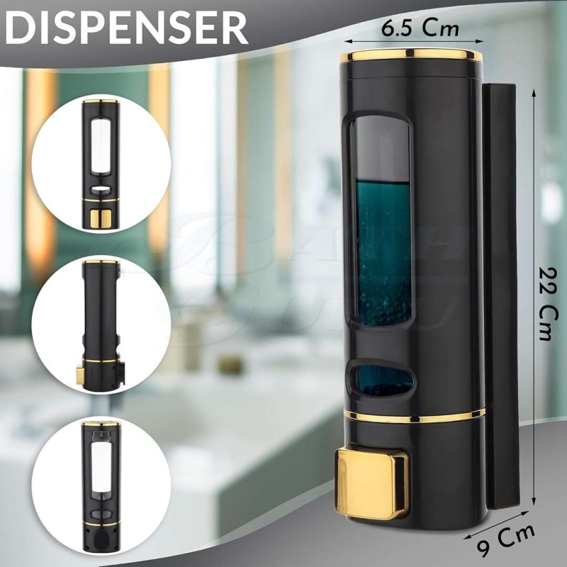 The BATH GURU Wall-Mounted Liquid Soap Dispenser in an elegant Black Gold finish features a durable ABS plastic body with a 400 ml capacity. Designed with a lockable, dust-protected cover and easy wall-mount installation, it is ideal for dispensing soap, shampoo, sanitizer, or shower gel in homes and commercial spaces.