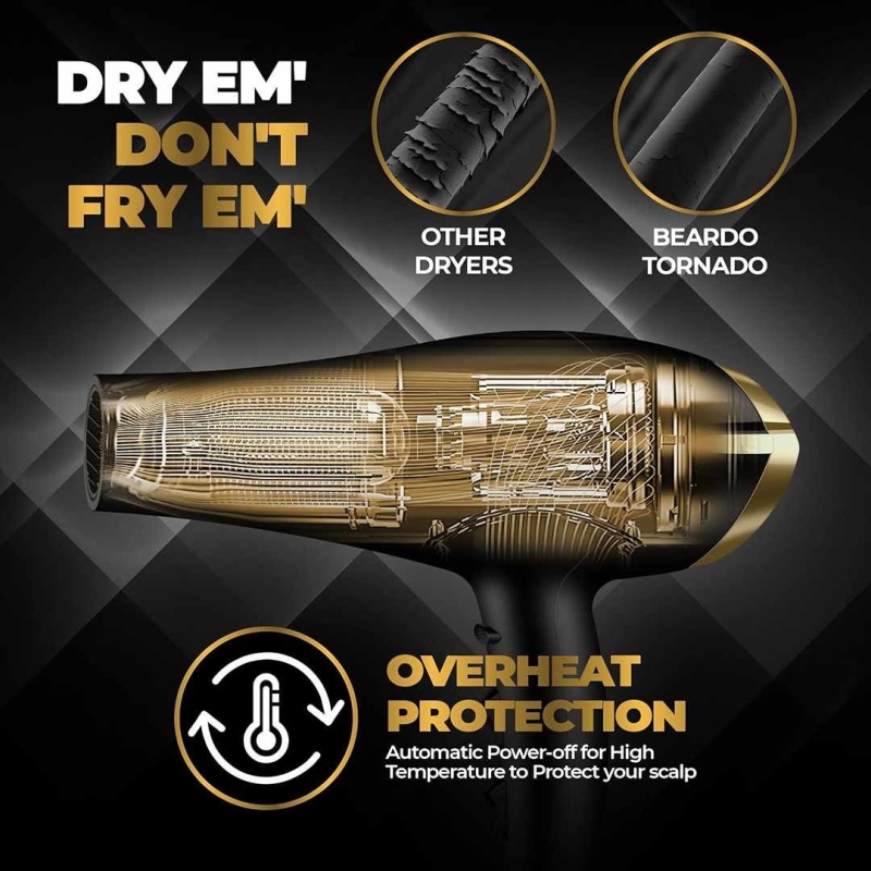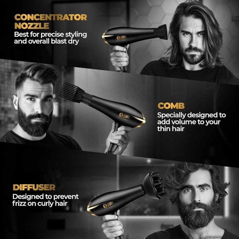 The Beardo Tornado Professional Hair Dryer is a powerful 2000W corded styling tool designed specifically for men. Featuring 3 temperature settings, 2 speed settings, and versatile attachments—including a diffuser, concentrator nozzle, and comb—it offers a customized grooming experience. With advanced EHD+ technology, overheat protection, and a cool shot button, this dryer ensures safe, quick, and frizz-free styling. A 2.5-meter cord adds convenience, making it ideal for at-home or professional use.