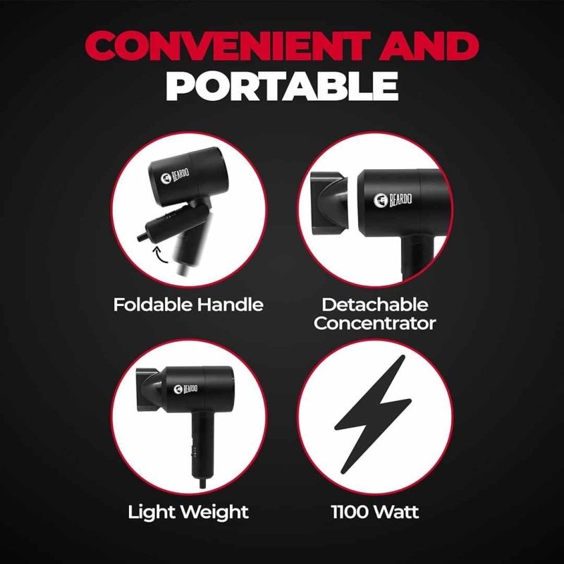 The Beardo Styling Gun Hair Dryer delivers salon-like performance with its 1100W motor and dual-speed, triple-temperature settings. Designed for precision styling and safety, it features a concentrator nozzle and advanced overheat protection. Its foldable, compact design makes it perfect for travel, offering convenient and powerful styling on the go.