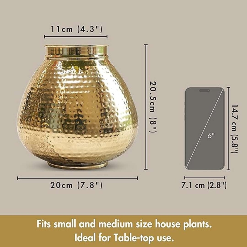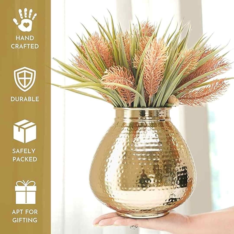 The BEHOMA Gold Round Vase is a handcrafted metal vase with a hammered finish, perfect for artificial or real flowers. Its elegant, traditional design adds a luxurious touch to living rooms, offices, bedrooms, or kitchens, and makes an ideal gift for special occasions.