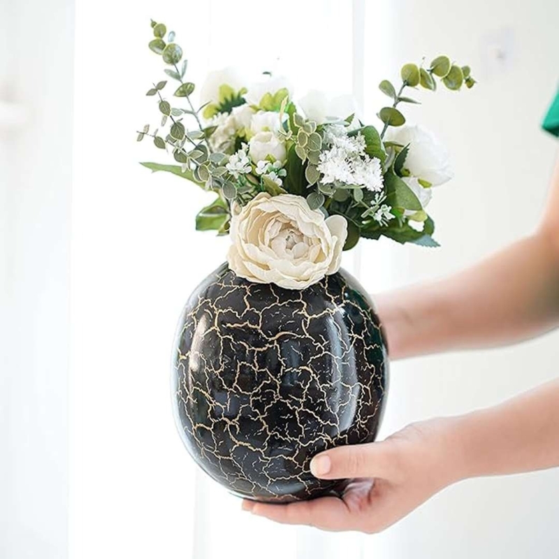 This handcrafted BEHOMA Black Crackled Ball Vase is made of high-quality iron and features a premium crackled finish, adding elegance and sophistication to any room. Its sturdy construction, soft anti-scratch base, and versatile design make it ideal for displaying fresh or artificial flowers, or as a stand-alone décor piece. Perfect for living rooms, bedrooms, offices, and gifting occasions.