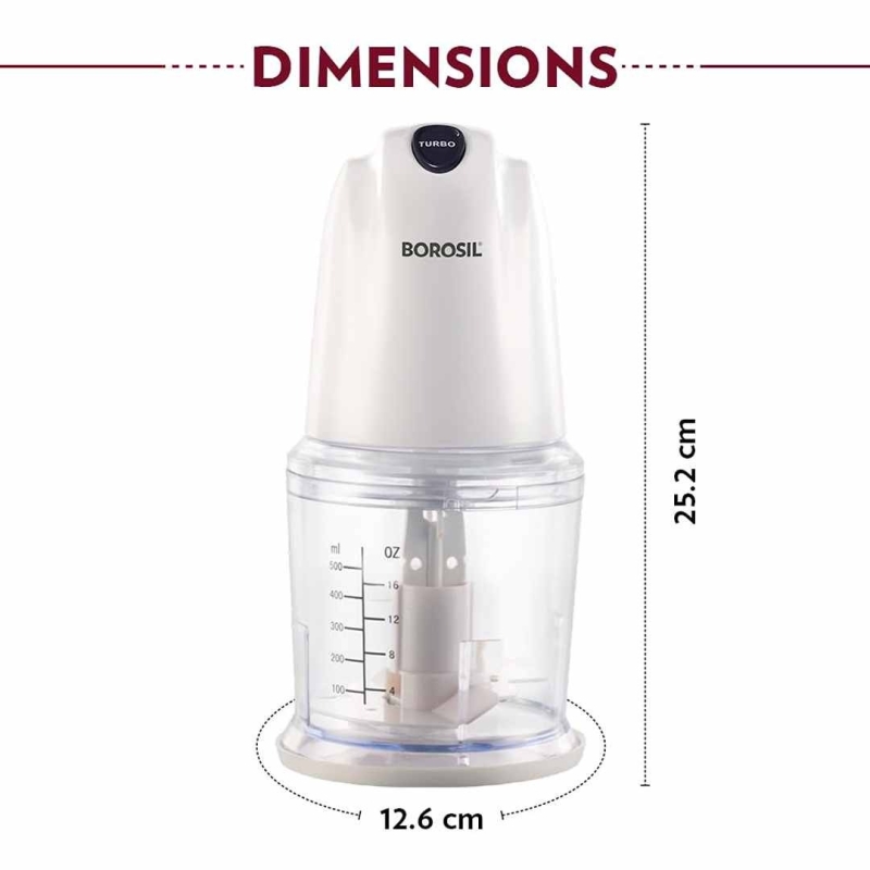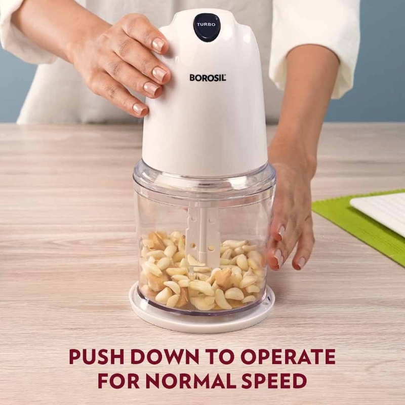 The Borosil Chef Delite Electric Chopper is a compact and powerful kitchen tool designed for chopping, mincing, and whisking. Featuring a 260W 100% copper motor and two-speed options including turbo mode, it ensures efficient performance for a range of kitchen tasks. Its 500ml 'Chop-Serve-Store' bowl, stainless steel blades, and included whisking attachment make it a versatile appliance. Safety is prioritized with a motor mount switch, while its space-saving design makes it perfect for everyday use. A reliable kitchen assistant from Borosil, backed by trusted Indian manufacturing.