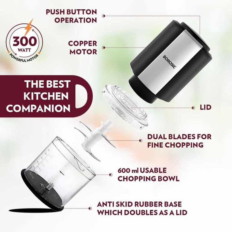 The Borosil Chef Delite 300W Electric Chopper is a smart, efficient kitchen appliance built for hassle-free chopping, mincing, whisking, and dicing. Featuring twin stainless-steel blade technology, a 600ml ‘chop-n-store’ bowl with lid, and a powerful yet silent 300W motor, this chopper delivers precision and convenience. Enhanced with auto shut-off for safety, anti-skid base, and dishwasher-safe parts, it's an ideal tool for modern kitchens looking for speed and versatility.