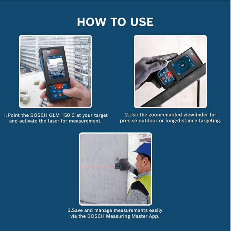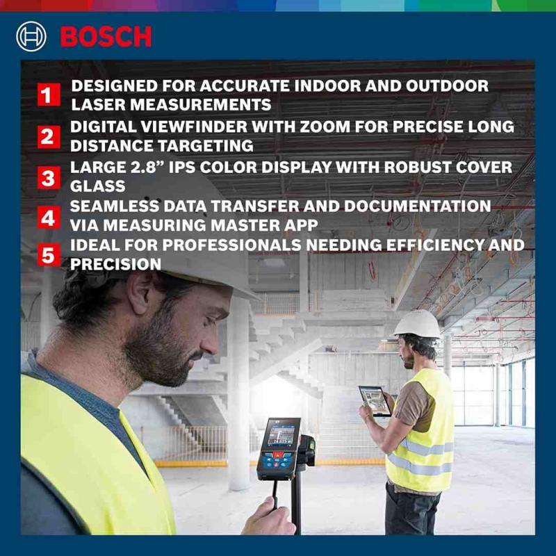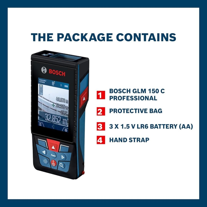 The Bosch GLM 150C Laser Distance Meter is a high-precision measuring tool designed for professionals, offering a range of up to 150m with ±1.5 mm accuracy. Equipped with a 2.8” IPS color display, integrated digital viewfinder with zoom, and Bluetooth Smart connectivity for seamless data transfer via the Measuring Master App. Built to last with IP54 protection, it is ideal for both indoor and outdoor applications.