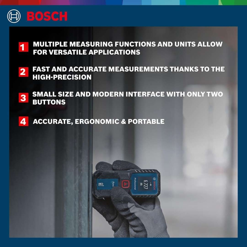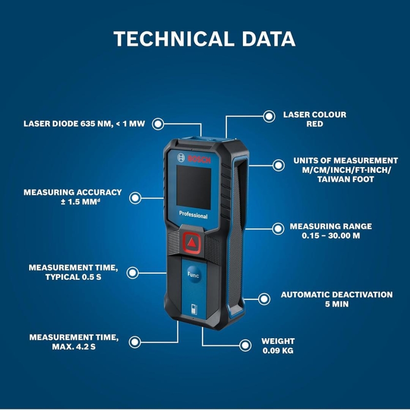 The Bosch GLM 30-23 Laser Distance Meter is a compact, ISO-certified measuring tool designed for professionals and DIY users. With a measuring range of up to 30 meters, it offers multiple functions including distance, area, volume, and continuous measurement. Featuring a simple two-button operation, durable IP54 protection against dust and water, and support for multiple units (m/ft/inch), it ensures accurate and reliable performance for any measuring task.