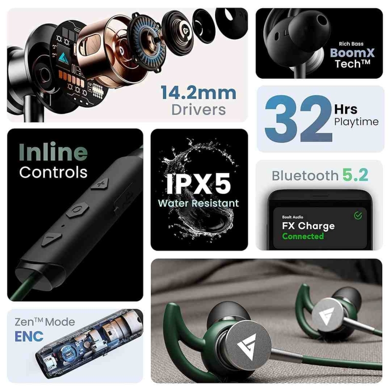 Experience non-stop music with Boult FXCharge—a stylish Bluetooth neckband offering 32 hours of playtime, ultra-fast Type-C charging (5 mins = 7.5 hrs), and dual device connectivity. Engineered with powerful 14.2mm bass drivers, Zen™ ENC Mic for clear calls, and an IPX5 water-resistant premium silicone build, it’s your all-day, all-weather audio companion. Proudly Made in India.