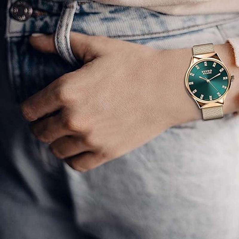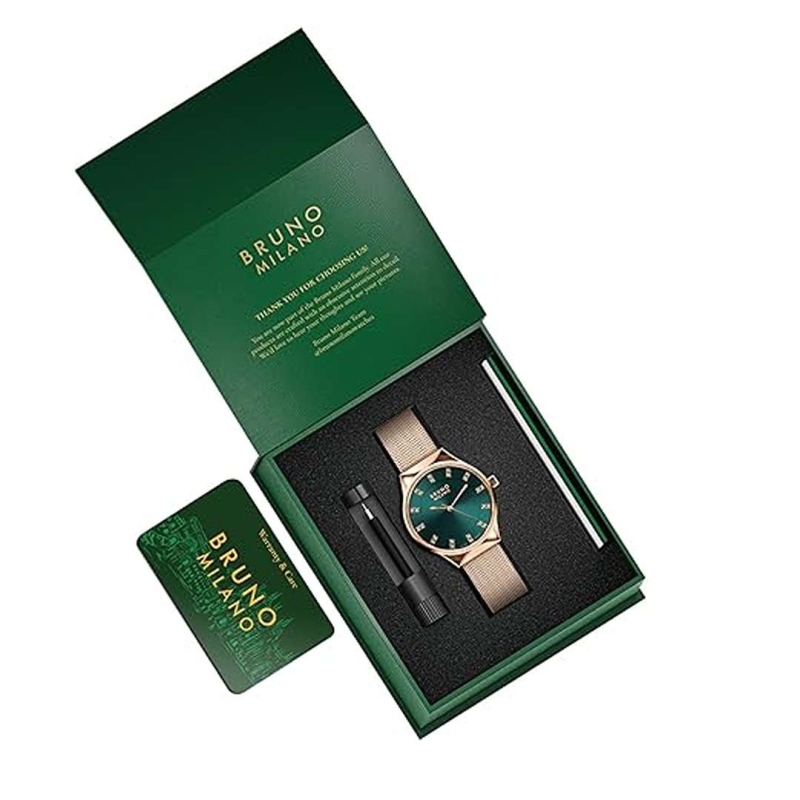 Bruno Milano BM1004-06 Women's Watch fuses vibrant gold-teal elegance with classic watchmaking. Designed with a 32mm stainless steel case, this stunning timepiece features a sophisticated dial, Japanese Quartz movement, and is water-resistant up to 3ATM. Perfect for both daily wear and special occasions, it arrives in a premium gift box—making it an ideal present for the modern woman.