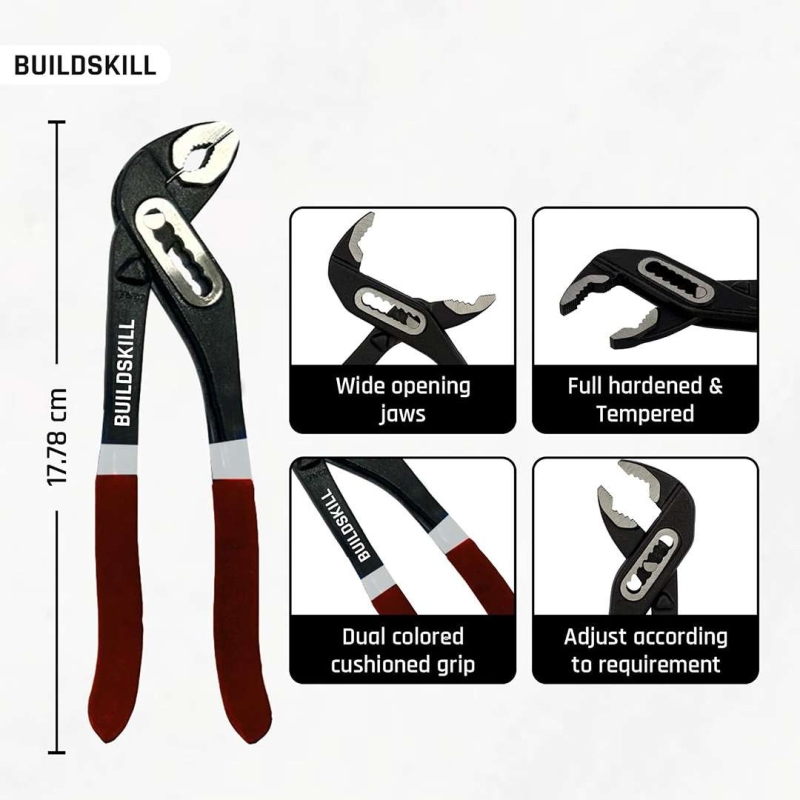 The BUILDSKILL 10-inch Water Pump Plier is a versatile and durable plumbing tool with an ergonomic grip, adjustable tilted head, and anti-rust finish. Ideal for gripping pipes, turning nuts and bolts, and holding irregular shapes, it’s a reliable addition to any DIY or professional toolkit.