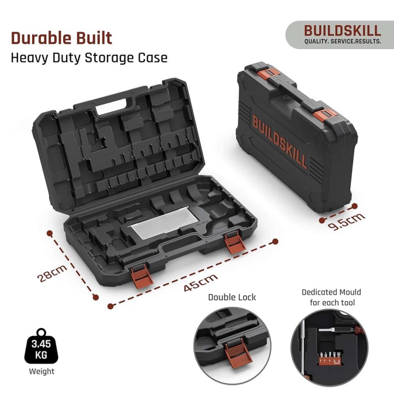 The BUILDSKILL 12V Cordless Impact Drill Tool Kit is a compact and versatile solution for home repairs and DIY projects. With a 10mm chuck, variable speed, reverse function, and an ergonomic lightweight design, it delivers reliable performance and comfort. The complete 69-piece tool set ensures you have everything needed for drilling, fastening, and everyday household tasks.