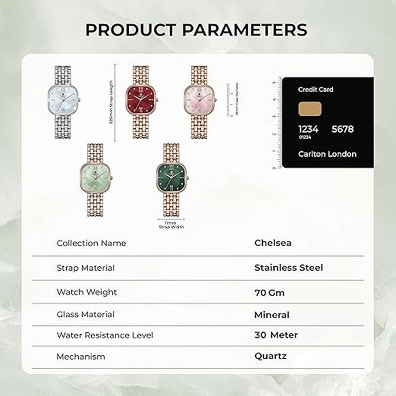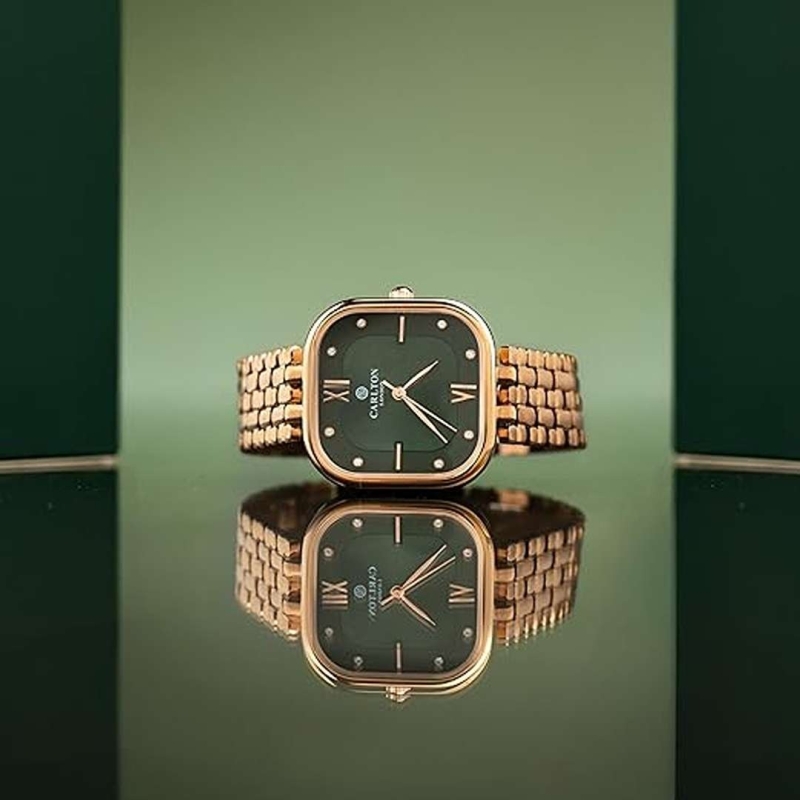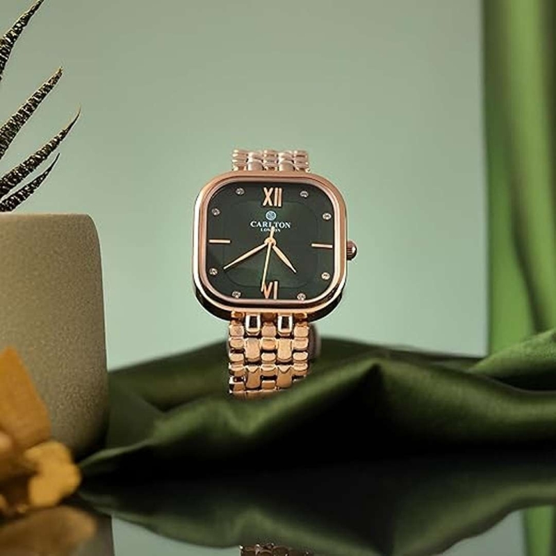 The Carlton London CLSSCDGRN Ladies’ Analog Watch is a perfect blend of elegance and performance. Featuring a sophisticated emerald green dial and a luxurious rose gold brass strap, this watch adds a touch of class to any outfit. With a reliable quartz movement, mineral glass protection, and 3ATM water resistance, it's built for both beauty and durability. Backed by a 1-year manufacturer warranty, this timepiece is ideal for daily wear or special occasions.