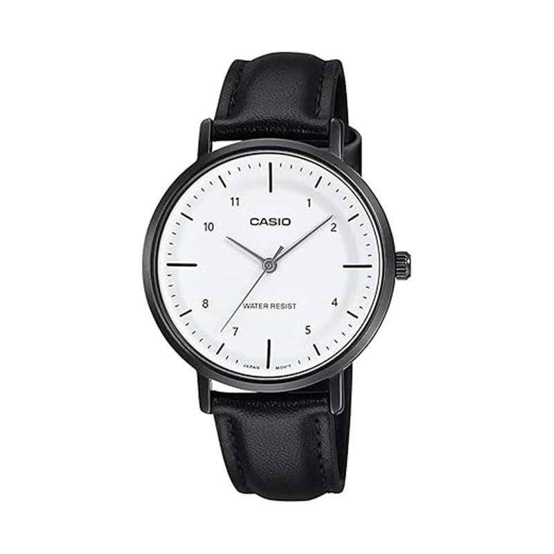 The Casio LTP-VT03BL-7BDF is a refined and minimalist analog women’s watch designed for everyday wear. Featuring a sleek white dial, black leather strap, and a concave-shaped dial that contours to your wrist, this watch offers both comfort and sophistication. With its tang buckle clasp, stainless steel case, and water resistance for daily use, it’s the perfect blend of durability and elegant simplicity — ideal for casual or formal wear.