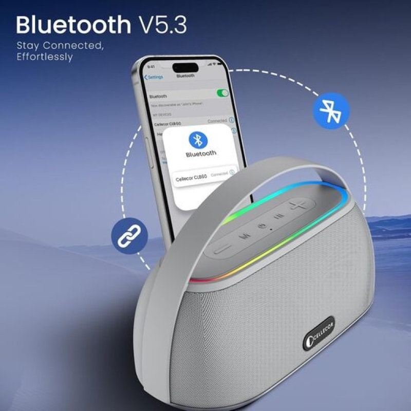 The Cellecor CLB60 GROOVE is a powerful and portable 10W Bluetooth speaker designed for both indoor and outdoor entertainment. With 10 hours of playtime, Bluetooth 5.3, 9 RGB light modes, and a water-resistant build, it delivers immersive sound and vibrant visuals wherever you go. Lightweight and easy to carry, it supports multiple devices and offers user-friendly touch controls, making it perfect for travel, parties, and everyday use.