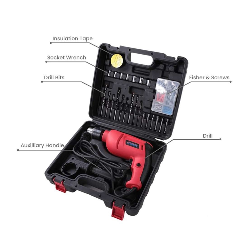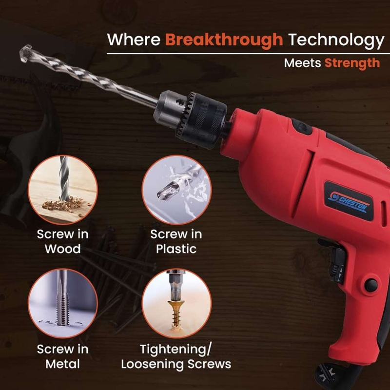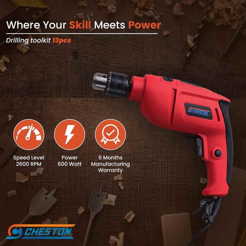 The CHESTON 13-in-1 Corded Drill Tool Kit is a powerful and versatile combination drill designed for home DIY and light professional use. Featuring a 600W motor, 13mm chuck, and a complete accessory kit packed in a hard case, it offers reliable performance, durability, and easy portability for a wide range of drilling and fastening tasks.