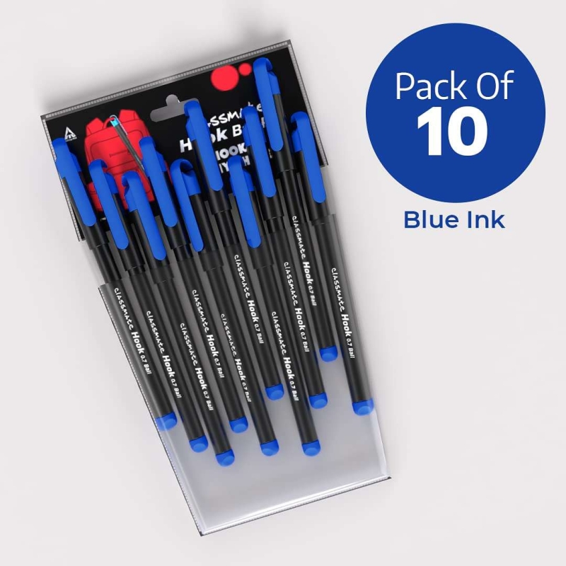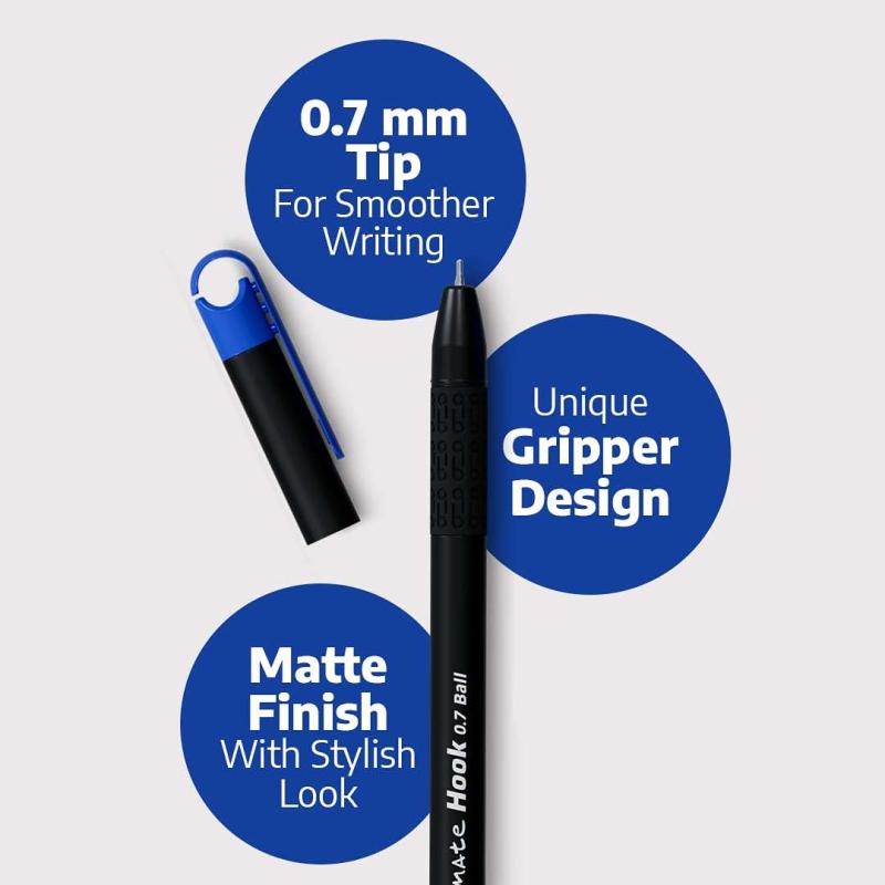 The Classmate Hook Ball Blue Ballpoint Pen comes with a premium matte black finish and an innovative industry-first clip design that lets you hook it onto your bag zip, ID card, or trouser loop for easy access. Its 0.7 mm fine tip ensures a smooth, effortless writing experience, while the soft, textured grip offers superior comfort and control. Lightweight at just 8 grams, this pen is ideal for everyday writing for adults.