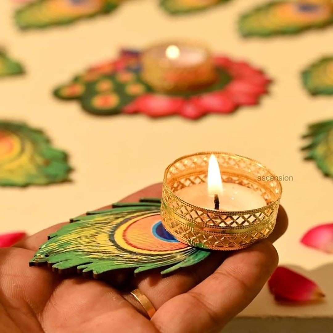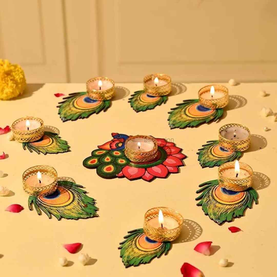 Add a vibrant and festive charm to your home with this set of 9 beautifully painted Morpankh (Peacock Feather) Design Tealight Candle Holders. Crafted from premium wood and finished with colorful detailing, these tealight holders are perfect for indoor festive décor. Ideal for religious events, Diwali celebrations, or as spiritual gifts, these tealight holders enhance the ambiance with tradition and elegance.