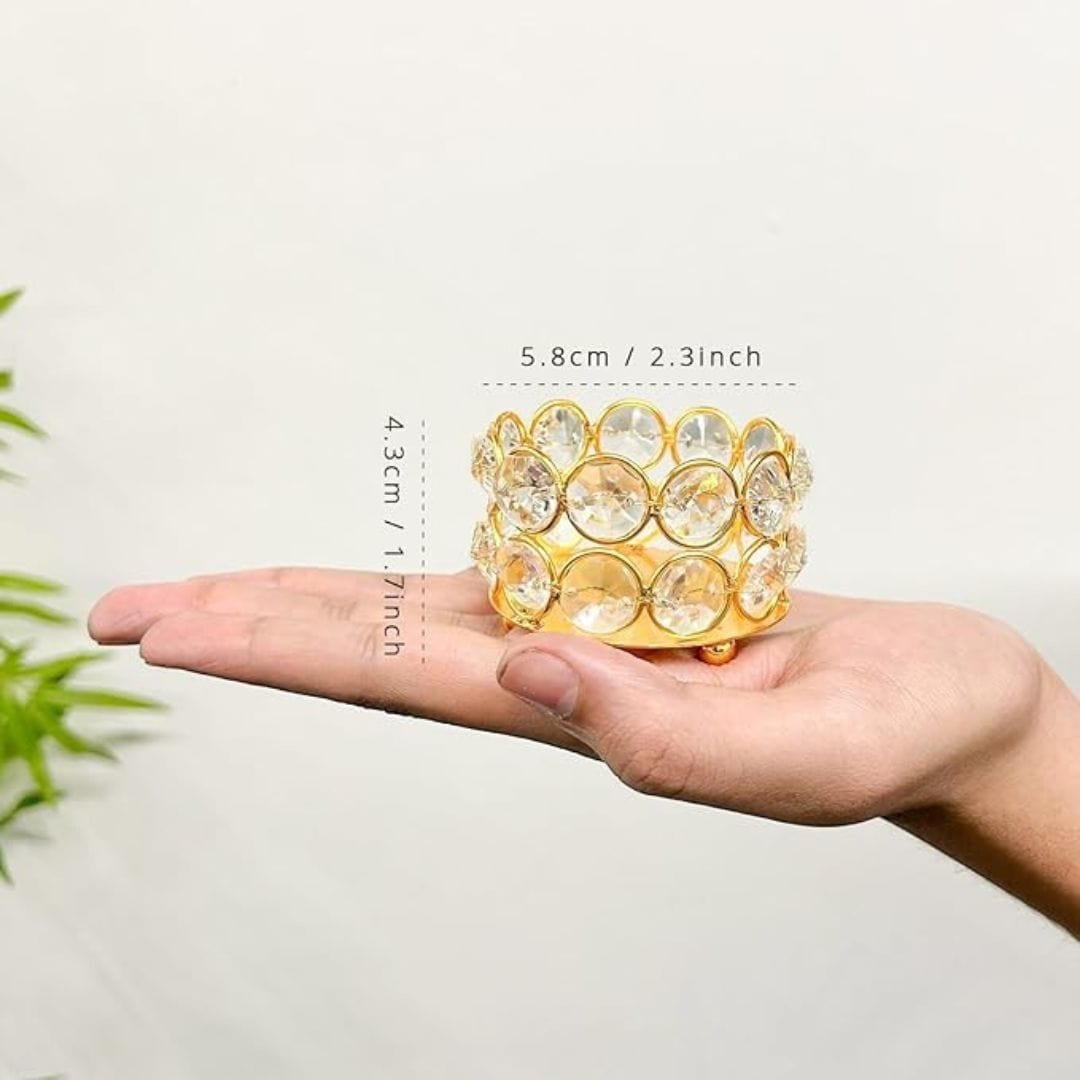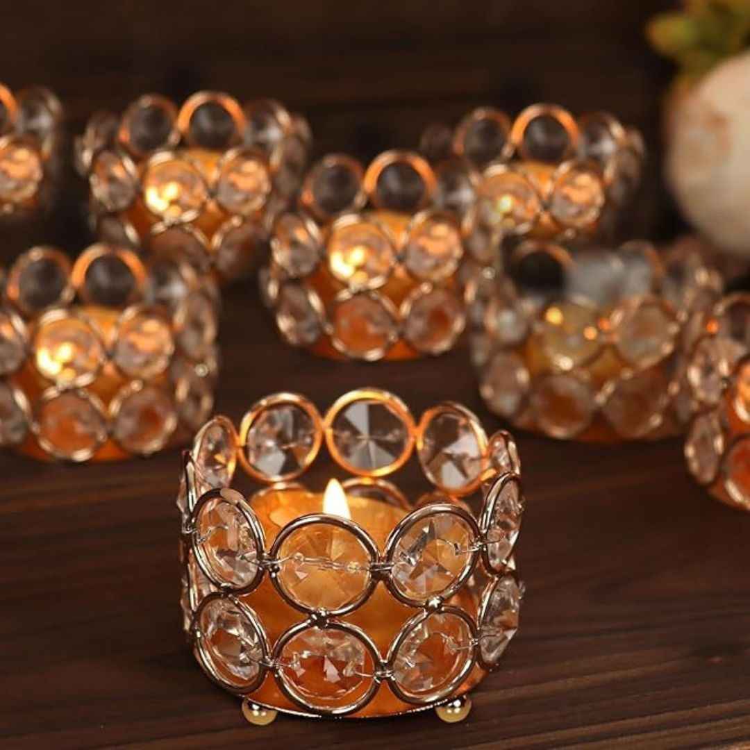 Add a touch of elegance to your festive décor with this set of 8 golden crystal tealight candle holders from TIED RIBBONS. Crafted from metal and adorned with crystals, these compact yet stylish holders bring warmth and charm to any celebration or space.