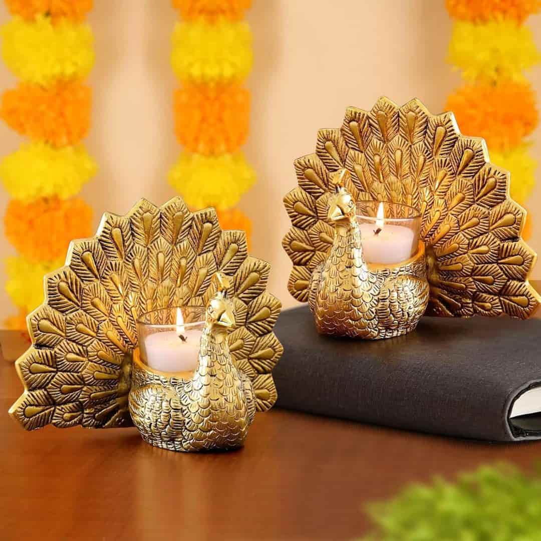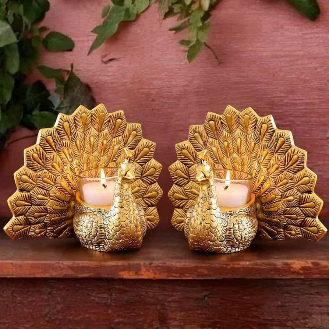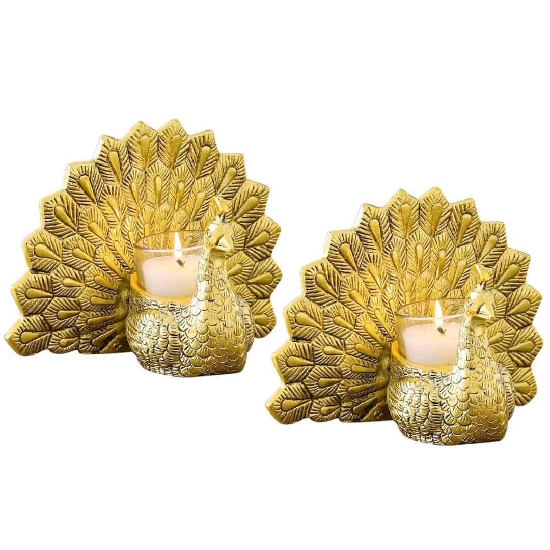 Enhance your home décor with the Tied Ribbons Decorative Peacock Shaped Tea Light Candle Holders. Made from premium aluminium with a golden multicolour finish, this set of 2 elegant holders showcases a majestic peacock design, adding charm to festive decorations, table settings, or as thoughtful Diwali and housewarming gifts.