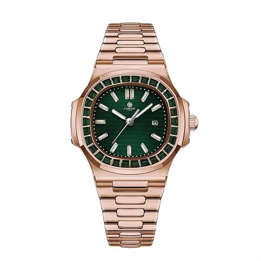 The Carlton London CLDPP-002 women’s watch is a bold and elegant timepiece featuring a striking green dial housed in a square 43mm metal case. With a rose gold stainless steel strap, 50-meter water resistance, and a date function, it blends style with everyday functionality. Perfect for fashion-forward individuals, this watch offers a refined look with a contemporary edge.