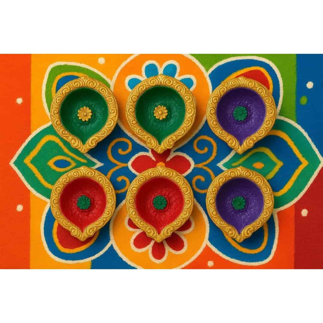 Brighten up your festive celebrations with the Peach N Pearl Designer Diya Set of 6. Crafted in vibrant red, purple, and green, these medium-sized diyas add elegance and tradition to your décor. Lightweight yet durable, this colourful set is perfect for Diwali, puja rituals, and festive gifting. Proudly made in India by Peach N Pearl, these diyas combine beauty with cultural charm.
