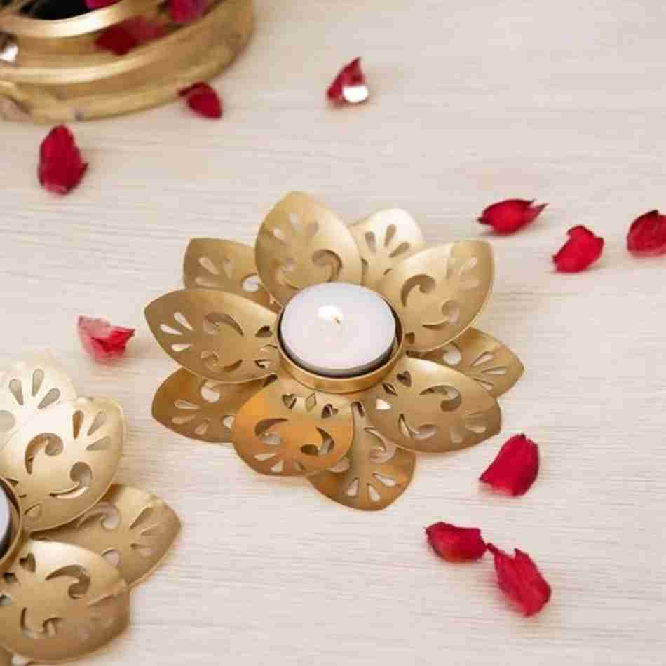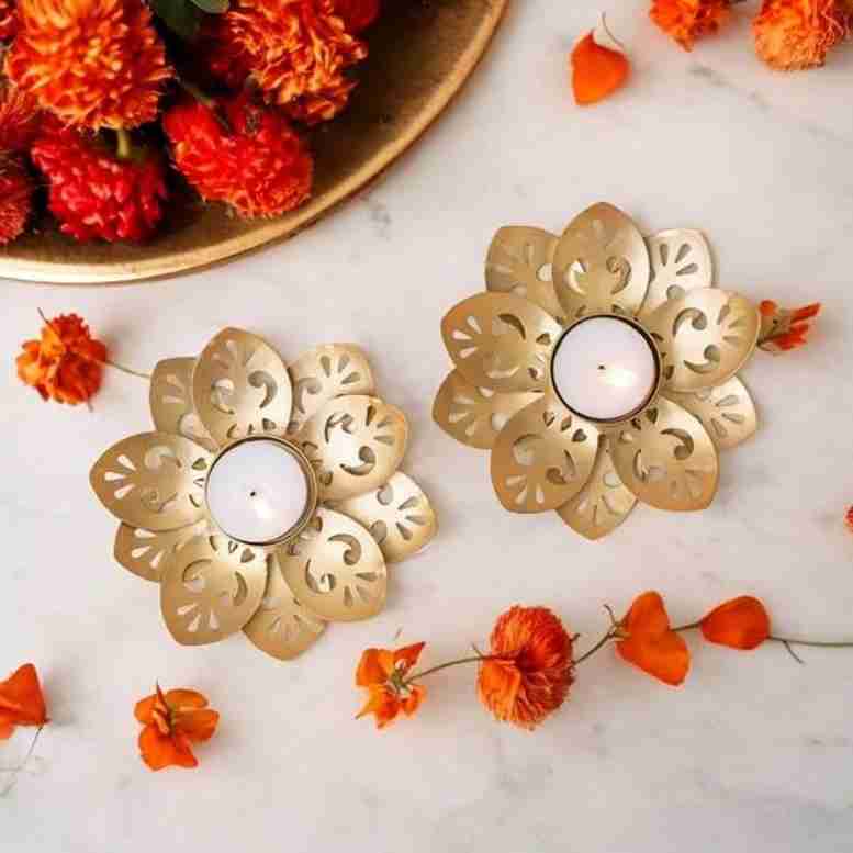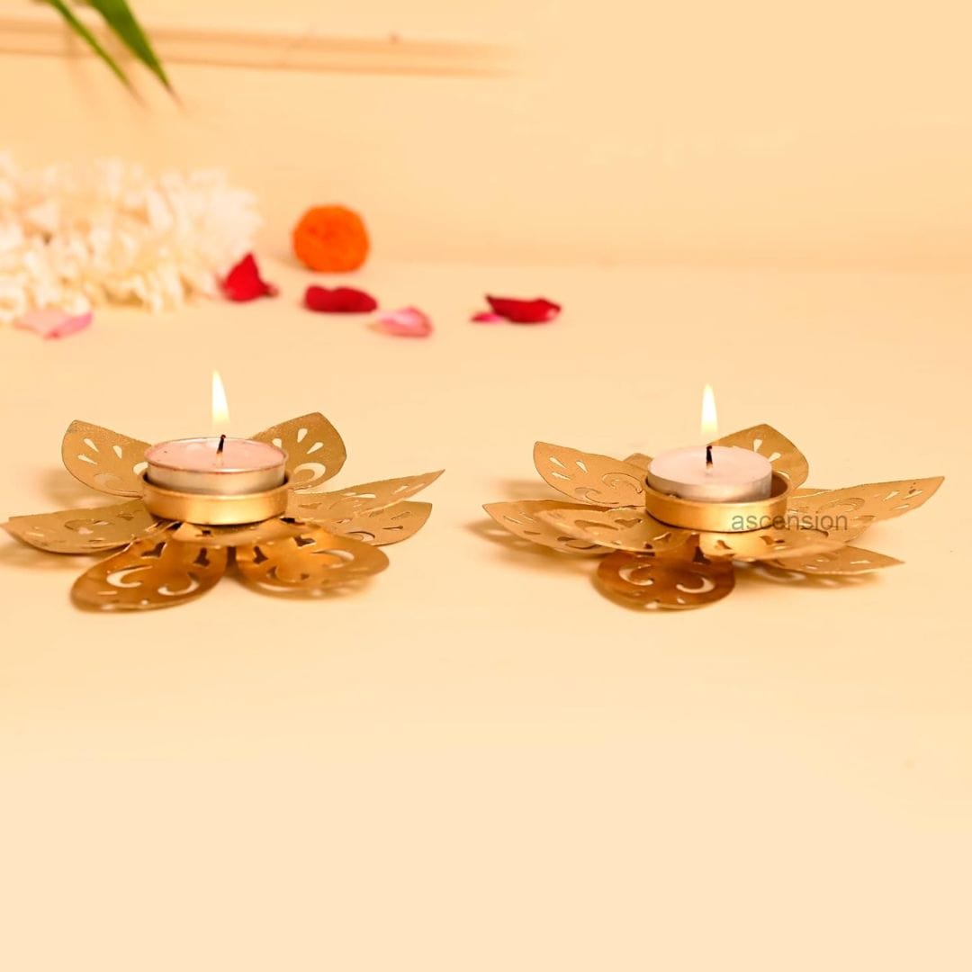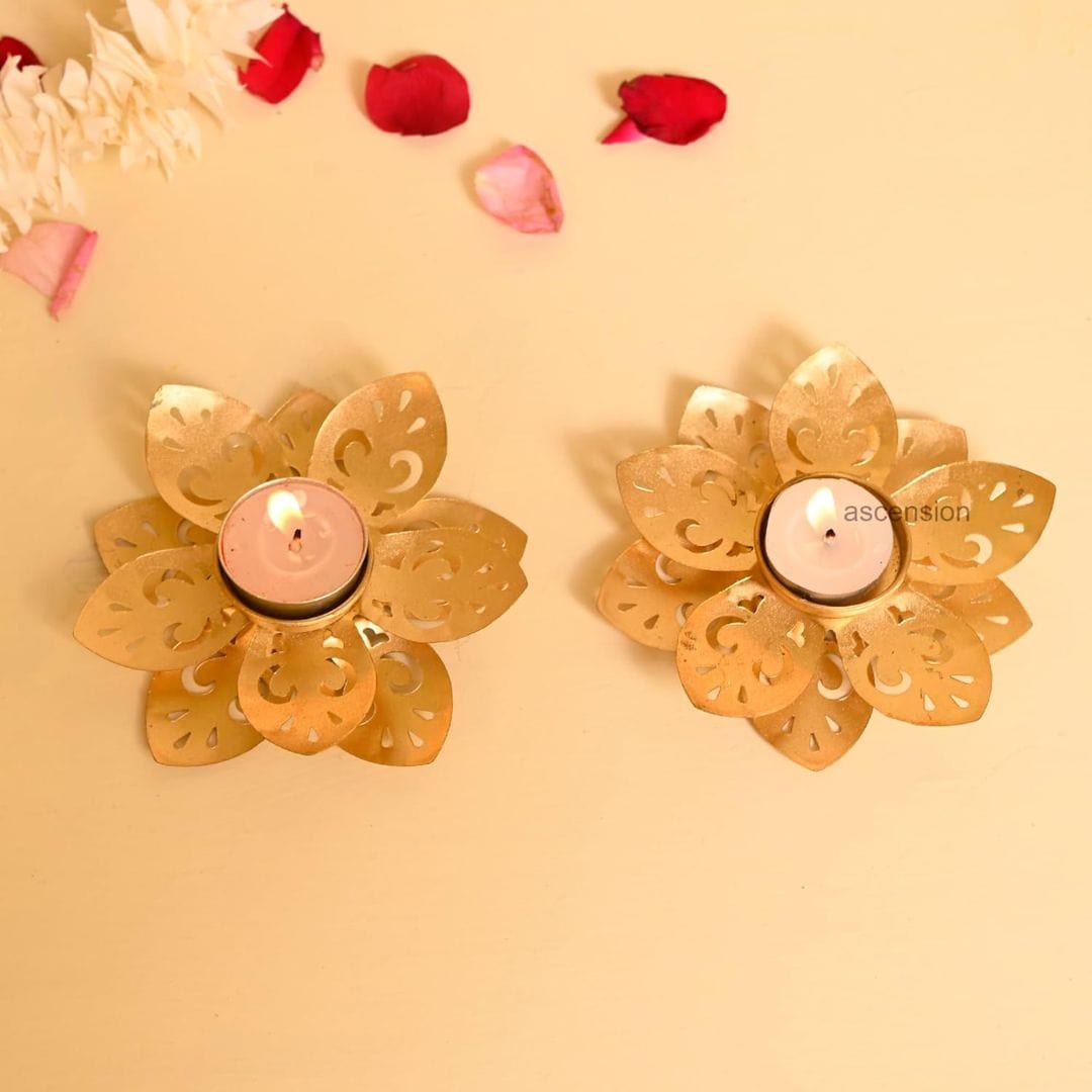 Ascension Set of 2 Golden Lotus Floral Decorative Metal Diyas for Diwali Decor Tea Light Candle Holderpack of 2