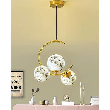 The Homesake Contemporary Ceiling Light combines an elegant design with modern aesthetics, featuring a geometric structure accented with a sleek gold finish. This versatile lighting fixture includes unique hand-blown blue marble glass shades that cast a vibrant yet soothing light, making it a stunning focal point for living rooms, bedrooms, and dining areas. Ideal for use as a chandelier, pendant light, or ceiling lamp, it complements various interior styles, from contemporary to minimalist. Crafted from high-quality metal and glass, this durable fixture ensures long-lasting performance. Weighing 0.77 kg and measuring 13L x 13W x 122H centimeters, it is easy to install and ideal for enhancing modern home interiors while providing ambient lighting. Compatible with E27 bulbs (incandescent, LED, flame bulbs), it adds charm and elegance to your space.