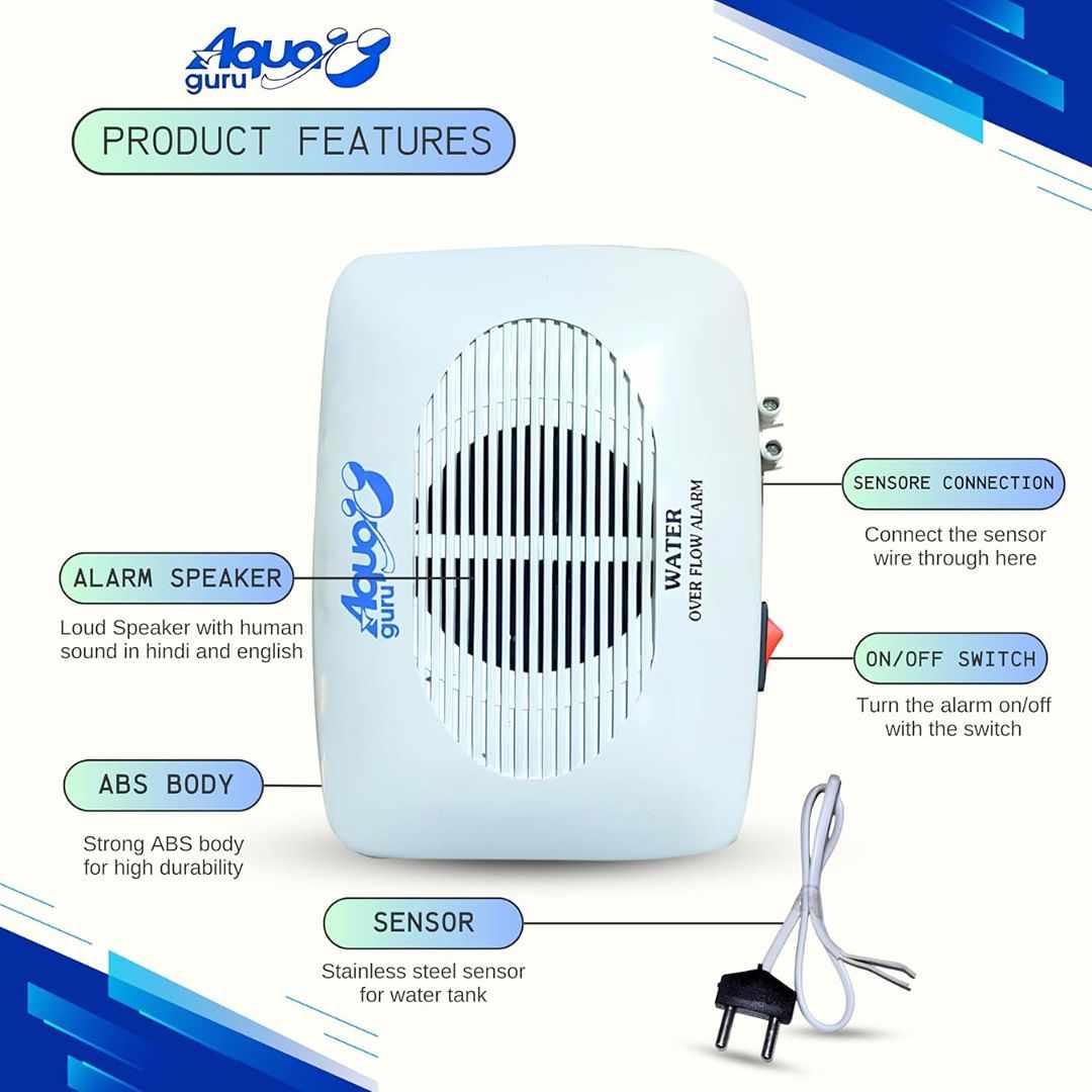 The AQUA GURU Dual Water Tank Alarm is a reliable battery-operated overflow alert system featuring human voice alerts in Hindi and English. With its durable ABS plastic body, shockproof 3V DC operation, and stainless steel sensor, it ensures safety and precision. Easy to install with its wall-mountable design and 15-meter wire, it’s ideal for homes looking to conserve water and prevent tank overflows.