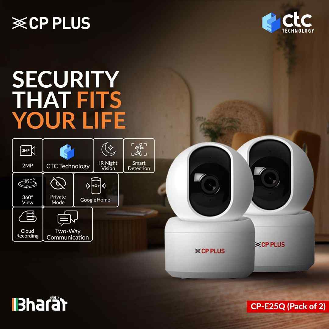 Monitor your home or office with the CP PLUS CP-E25Q Wi-Fi CCTV cameras, featuring Full HD 1080p resolution, 360° panoramic coverage, smart motion tracking, and encrypted data protection. With advanced CTC Cyber Secure technology, noise reduction, two-way audio, and control via the Ezykam+ app, these cameras offer a complete surveillance solution with user-friendly installation and real-time alerts.