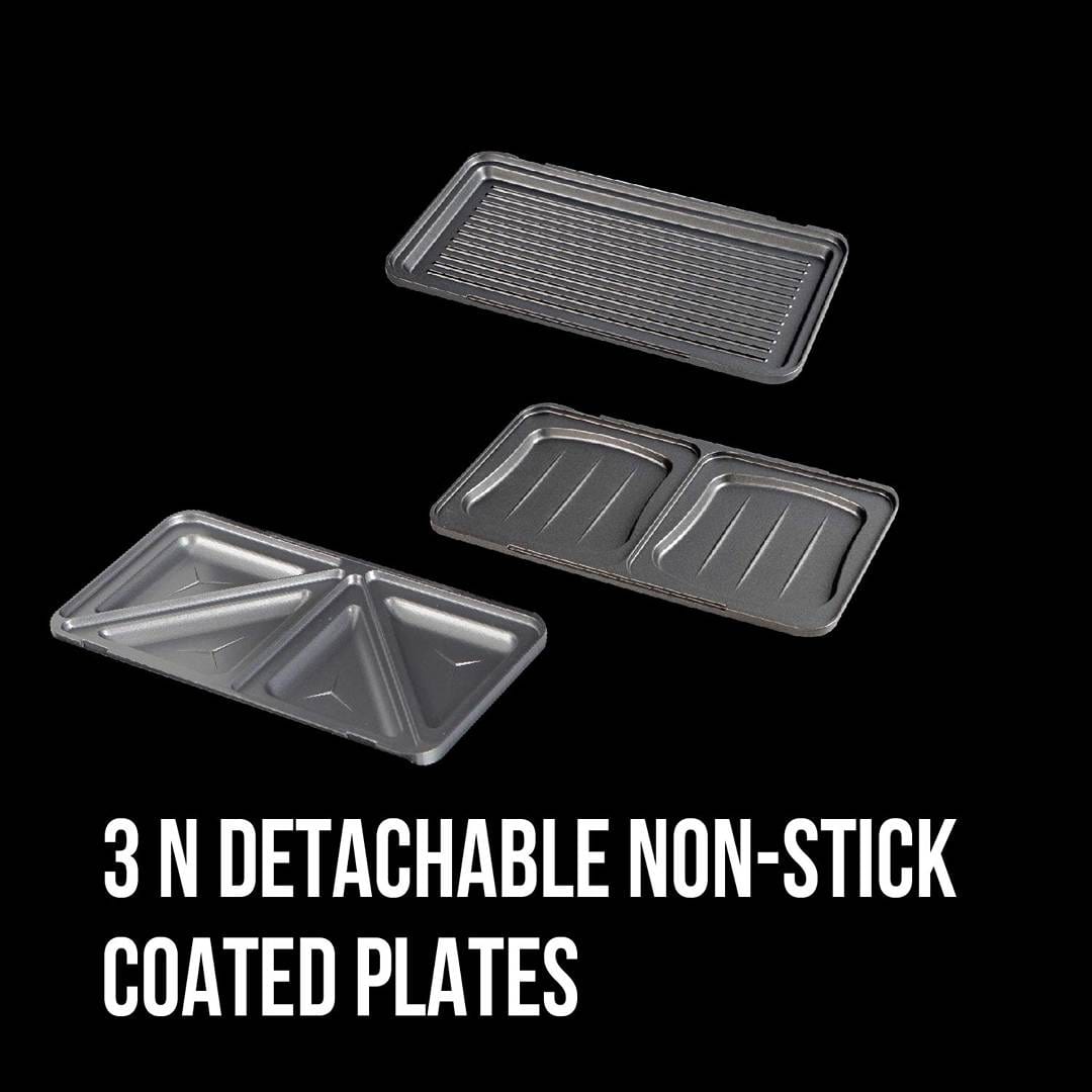 Included Components | 1 Main Unit with 3 Detachable Non-Stick Plates – Toast Plate, Grill Plate, Sandwich Plate |