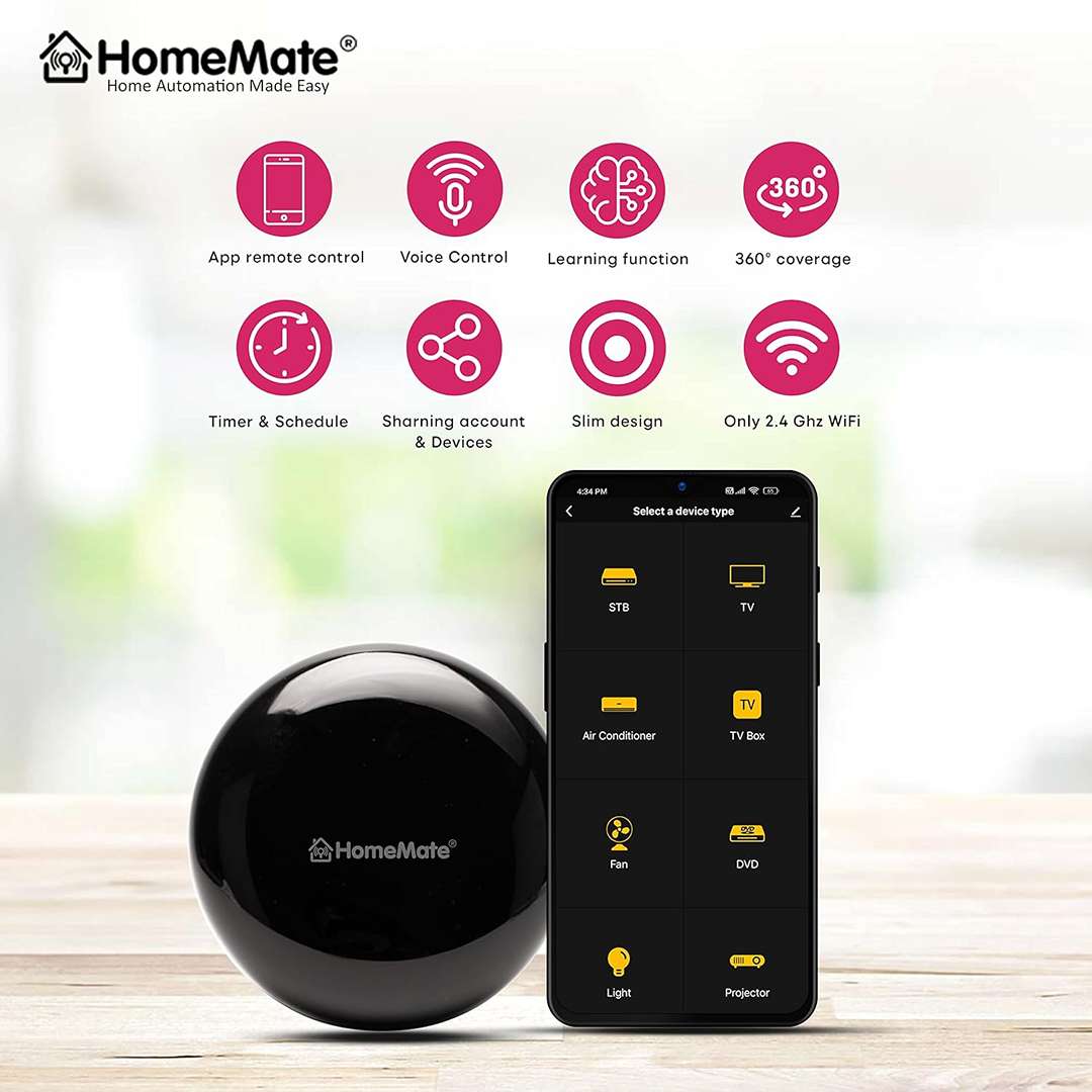 HomeMate Wi-Fi Smart IR Control Hub (Pack of 1) | Smart Air Conditioner Remote | Compatible With Alexa, Google Home | All In One Infrared Remote For Smart Home | Black